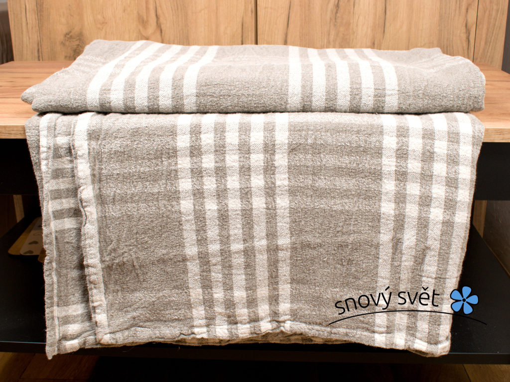 Pléd nebo česky deka ze 100% lněné látky vysoké gramáže i kvality. Vzor je žakárový, z jedné strany jsou světlé ornamenty na tmavém pozadí, z druhé strany tmavé kostky na světlém pozadí. Přírodní barvy dávají přehozu přirozenou krásu a příjemná látka jemnost na dotyk. Lněná tkanina se svou vysokou otěruvzdorností a pevností se hodí právě na tento typ výrobku. Je možné použít jej jako přehoz nebo deku na přikrytí. Taková deka bude v rodině i několik generací.