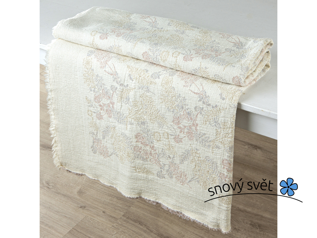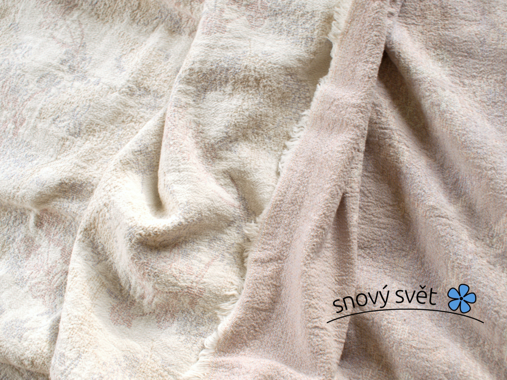 Jemný vzor v žakárovém provedení. Přední strana je krémová s jemným pastelovým květinovým vzorem v růžové a modré barvě. Druhá strana je barevná do růžových odstínů. To je náš nový lněný pléd. Je možné použít jej jako přehoz, deku nebo jak dětskou podložku na zem. V létě chladí a v zimě hřeje. Hodí se na pohovku samostatně nebo si deku povléknete do povlaku a můžete pod ní spát. Lněná tkanina se svou vysokou otěruvzdorností a pevností se hodí právě na tento typ výrobku. Taková deka bude v rodině i několik generací a bude to krásný dárek.
