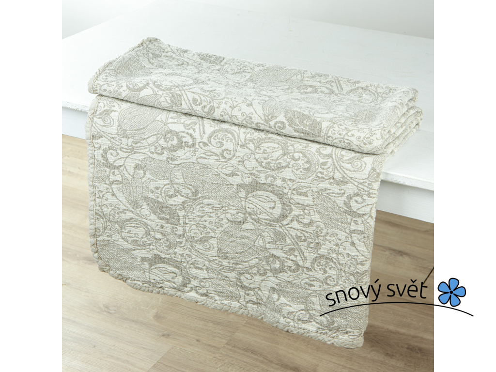 Rostlinný secesní vzor je vyobrazený na našem plédu. Vzor je žakárový, z jedné strany jsou světlé ornamenty na tmavém pozadí, z druhé strany tmavé ornamenty na světlém pozadí. Vzor není tištěný, ale vzniká tkaním přírodních lněných a krémových přízí. Látka má zajímavou "pokrčenou" strukturu. Lněná tkanina se svou vysokou otěruvzdorností a pevností se hodí právě na tento typ výrobku. Jedná se o přírodní materiál, který má přirozenou mačkavost.