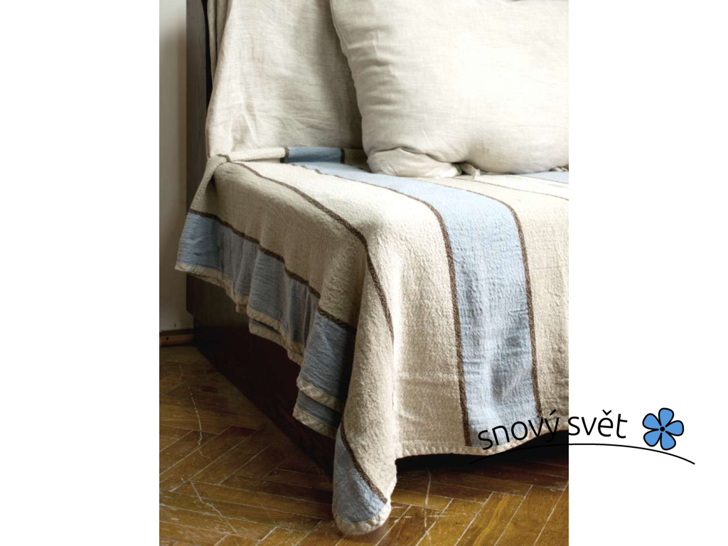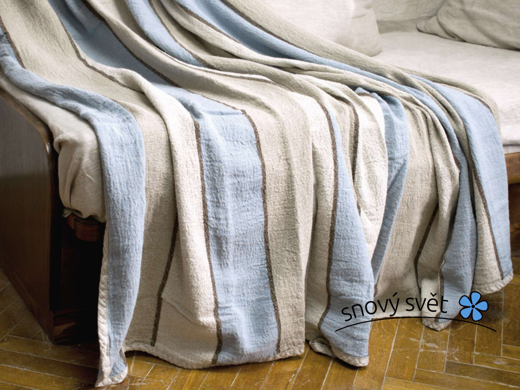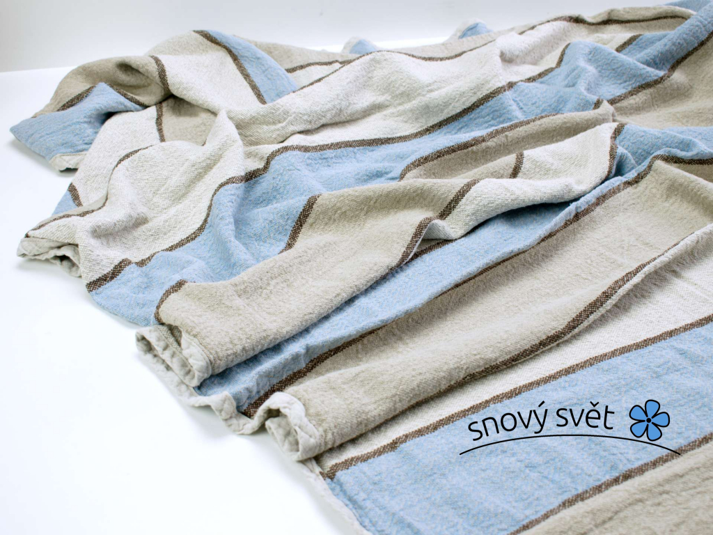 Pléd s oboustranným vzorem. Díky strukturovanému materiálu je len hustý a o vysoké gramáži. Je možné použít jej jako přehoz, deku nebo jak dětskou podložku na zem. V létě jej můžete povléci do povlaků a spát pod ním. Len je krásně vzdušný a prodyšný a udržuje správnou termoregulaci organismu. V zimě naopak zahřeje při posezení v křesle. Taková deka bude v rodině i několik generací. Lněná tkanina se svou vysokou otěruvzdorností a pevností se hodí právě na tento typ výrobku.