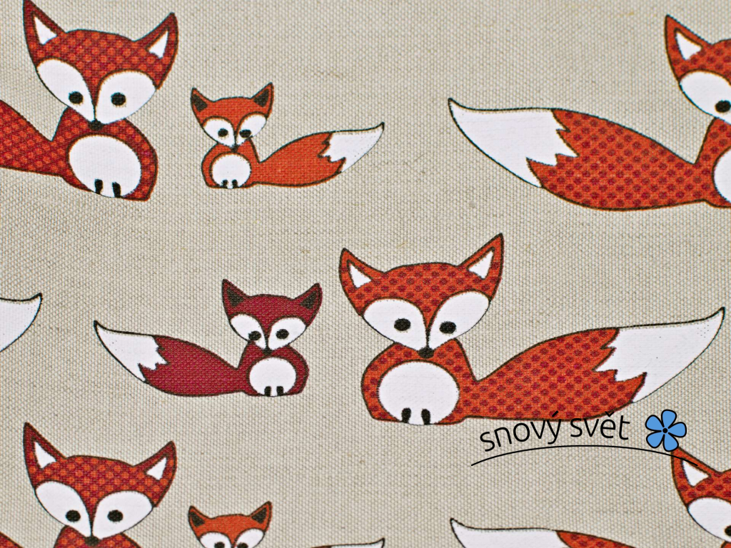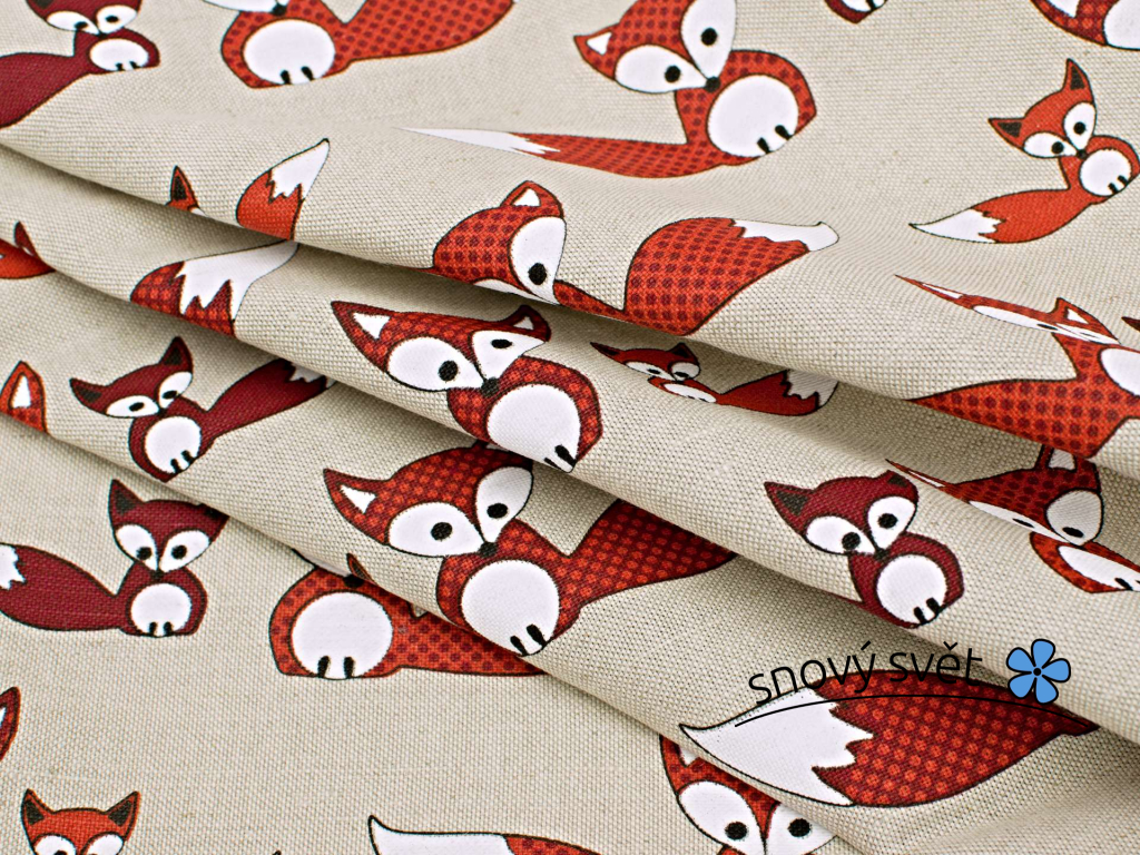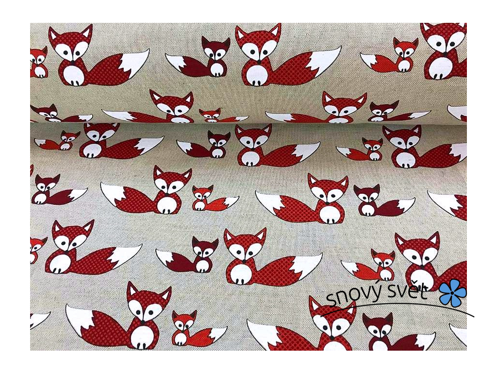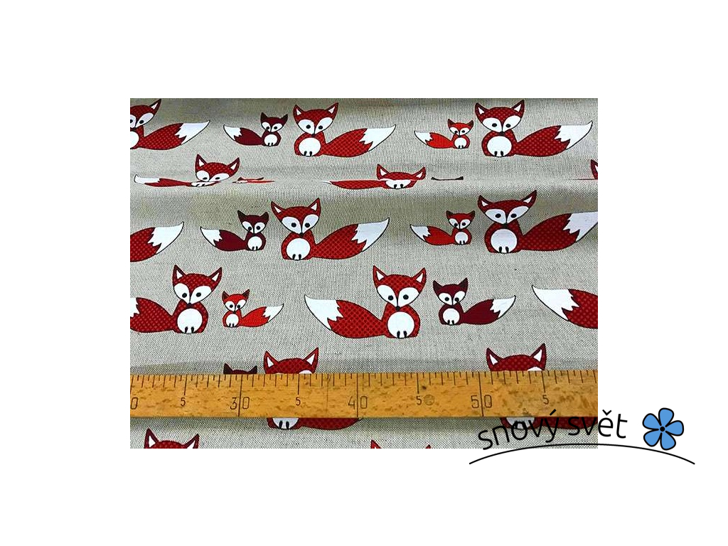 Lněná látka o střední gramáži v šedé barvě s potiskem LIŠEK. Jedná se o kombinaci krémové a šedé příze. Lněná látka je režná, není měkčená. Používáním změkne.