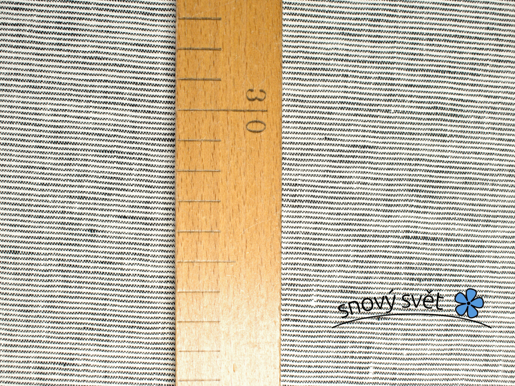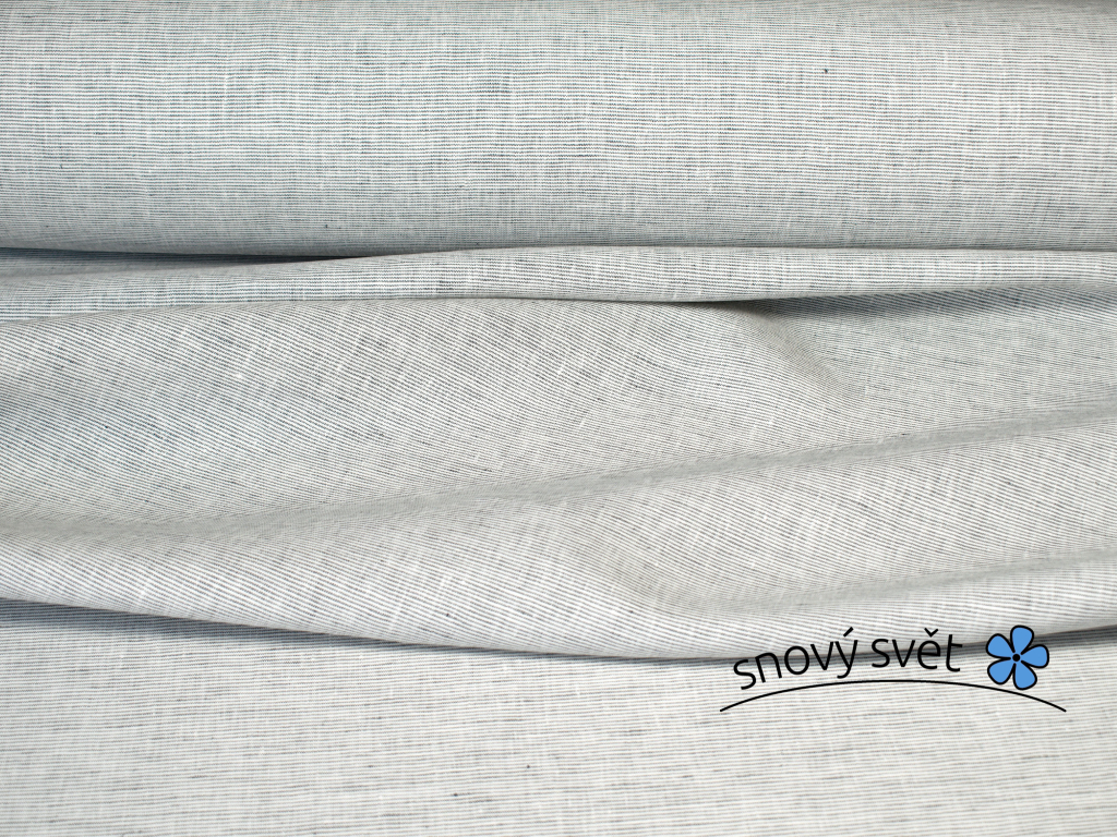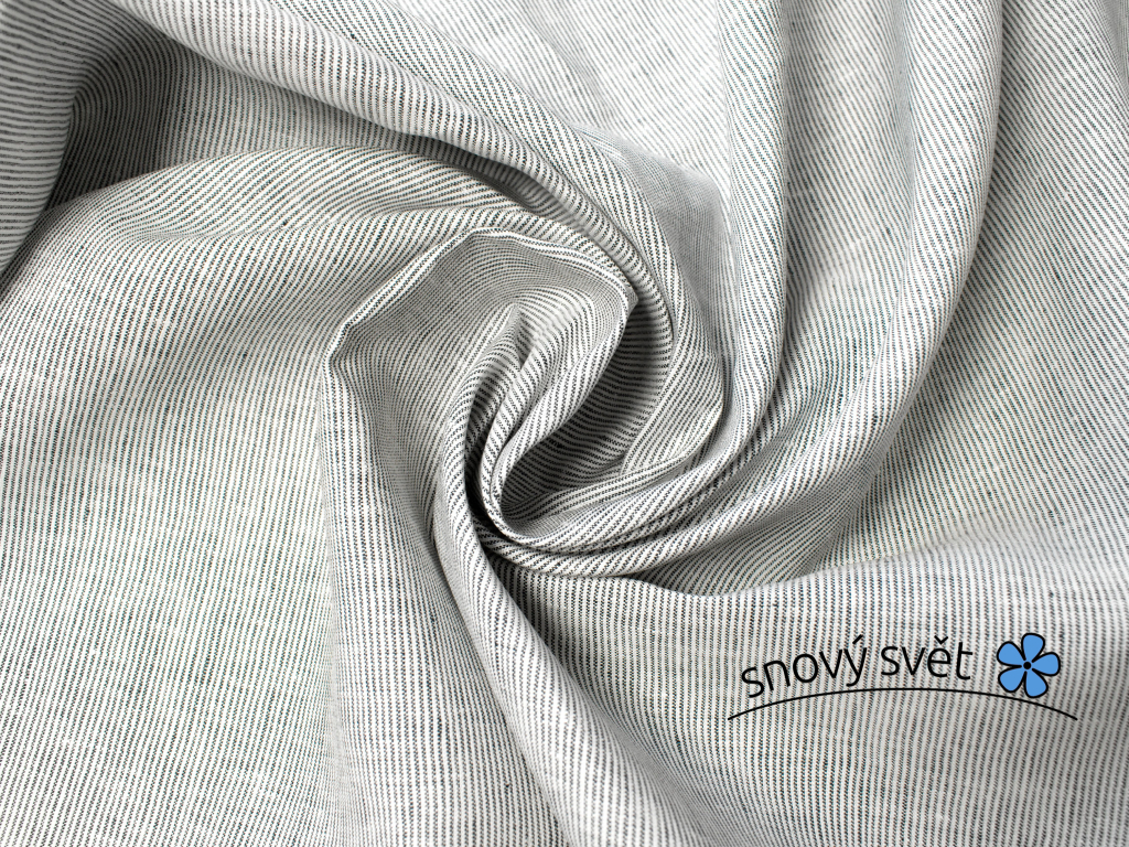 Jemná lněná látka v bílo-černém tenkém proužku - 100% len v TOP kvalitě. Látka je tkaná kombinací bílé a černé příze, jemná na dotek, přitom pevná a kvalitní. Úpravou je sanforizace, je tedy upravená již z výroby. Látka není z výroby měkčena, neprošla chemickým procesem doměkčení. Jako zadání pro výrobu bylo, aby bylo do procesu výroby vneseno co nejméně chemických úprav. Na první dotek se zdá "tuhá", ale po několika vypráních a jisté době používání krásně změkne.