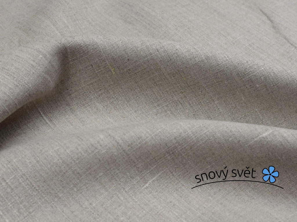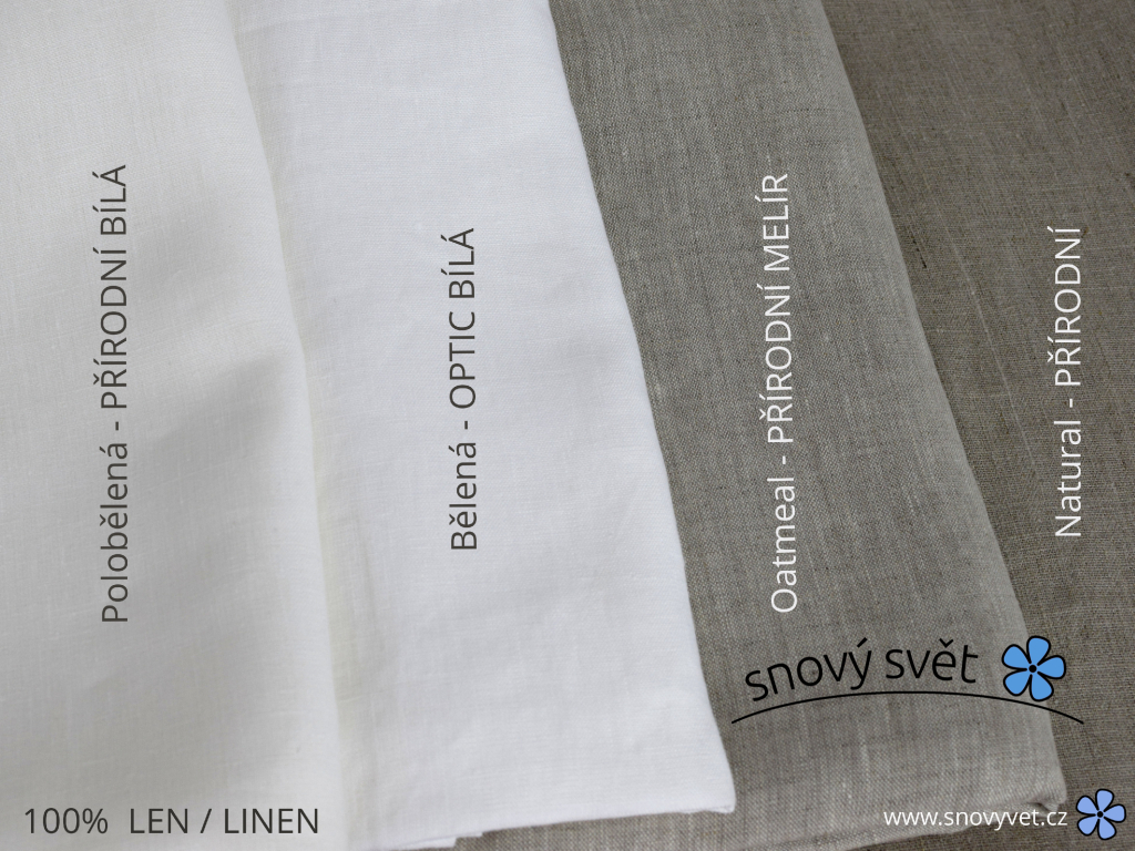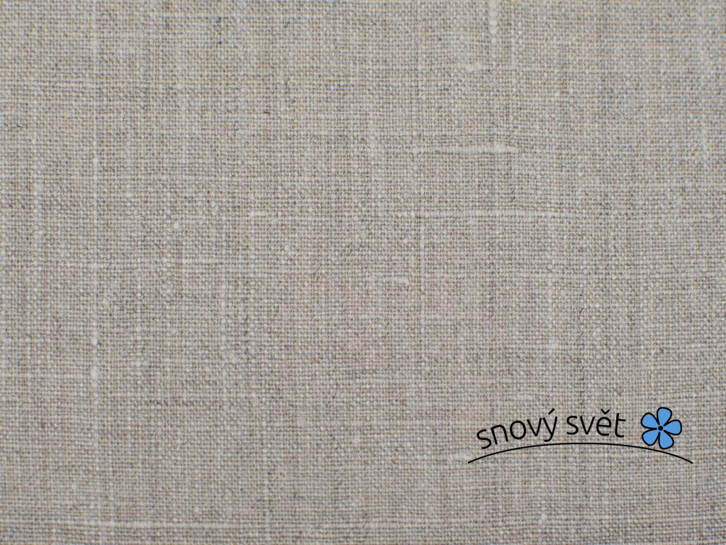 100% přírodní lněné plátno o vyšší gramáži, použité jsou silnější příze. Látka není praná ani jinak upravovaná, jedná se o režné plátno. Přírodní plátno bez úpravy bělením nebo barvením.