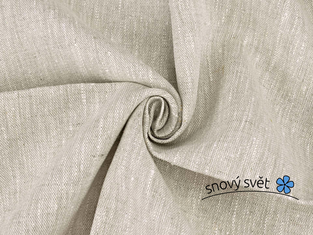 Přírodní lněné plátno o vyšší gramáži s bílým melírem. Na tkaní jsou použity silnější příze. Látka není měkčená ani předem vysrážená, je v režném provedení. Jedná se o oatmeal, kombinace bílé a přírodní příze. Látka má výraznější strukturu a je vidět přirozená nepravidelnost lněných vláken. Látku je vhodné před použitím vysrážet. Praním a používám bude měkčí a jemnější.