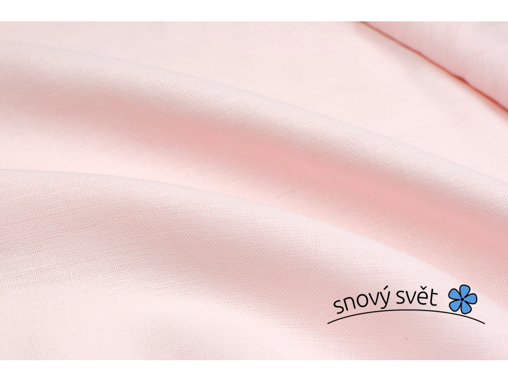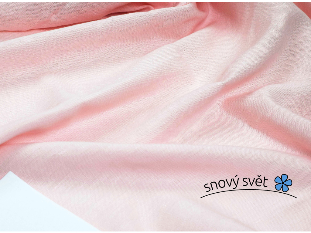 Světle růžové lněné plátno o střední gramáži. Látka je sanforizovaná, tedy praná a vysrážená již z výroby.