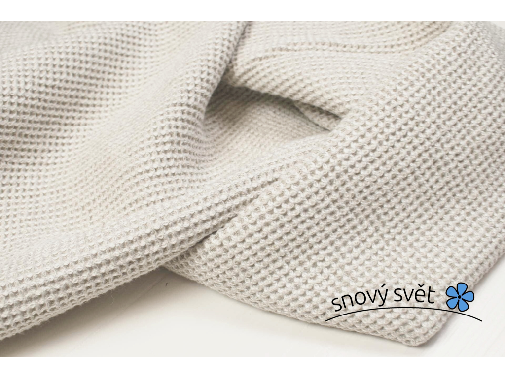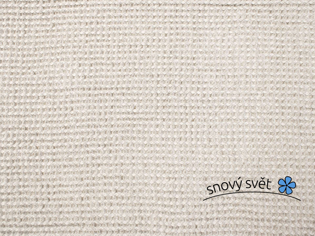 Lněná látka ve světle šedé barvě, která vzniká díky kombinaci bílé a přírodní příze. Má vaflovou strukturu, měkčená a velice příjemná. Možnost šití ručníků, županů, žínek i na polštáře. O vysoké gramáži.