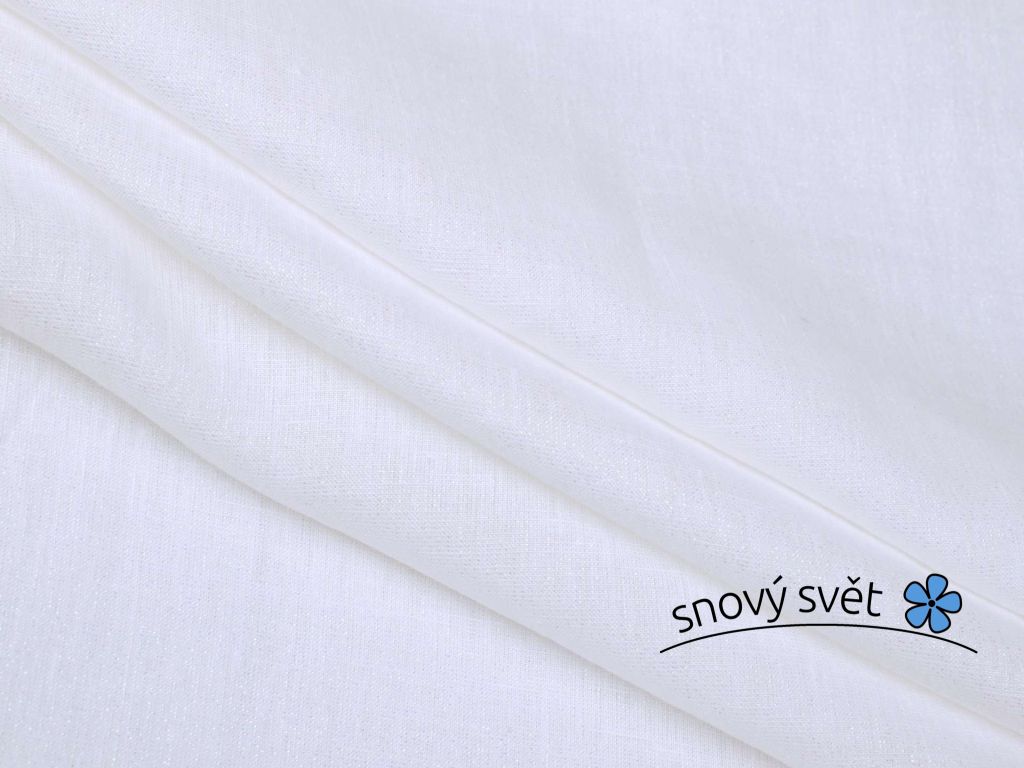 Lněná látka o nižší gramáži v zářivě bílé barvě. V látce je protkávaný LUREX, což je stužka vyrobená z hliníkové fólie a díky tomu se látka třpytí. Látka je měkčená a jemná. Metráž je jemně průsvitná.