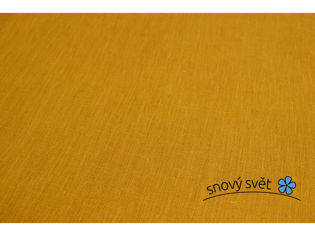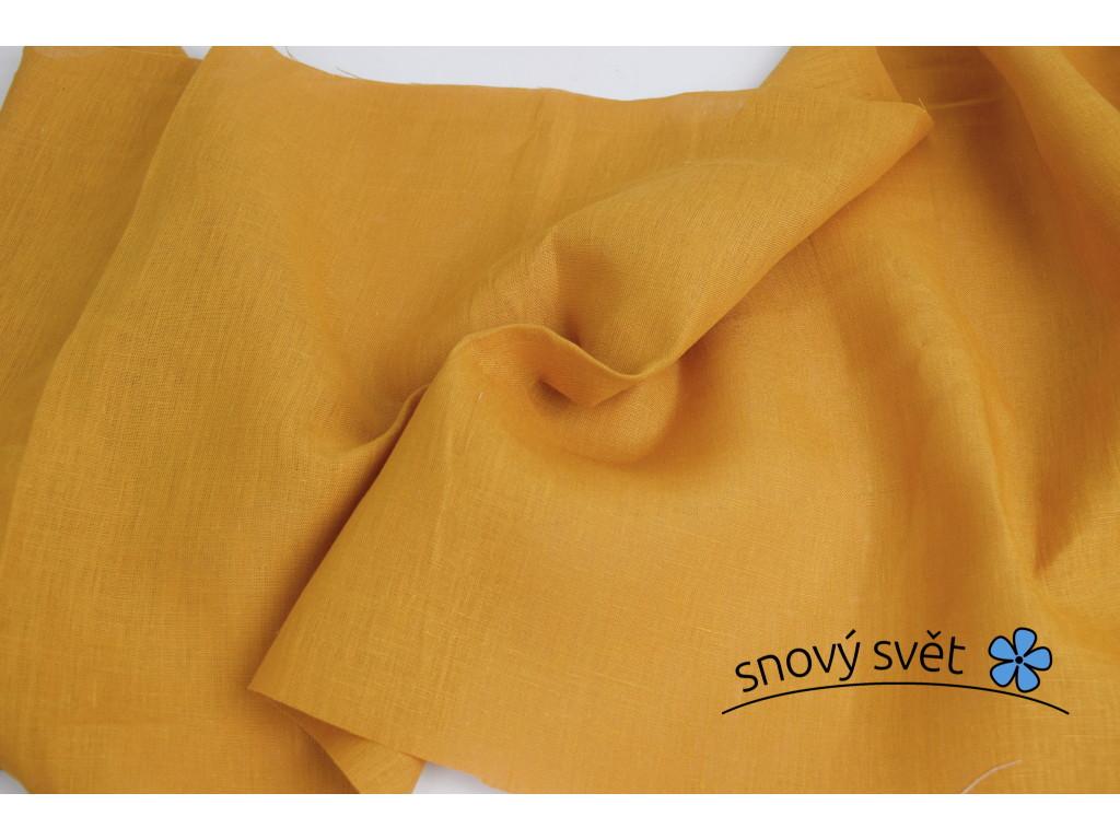 Lněná látka v tmavě žluté hořčiční barvě. Šíře - 260 cm. Látka není speciálně měkčená, používáním a praním krásně změkne.
