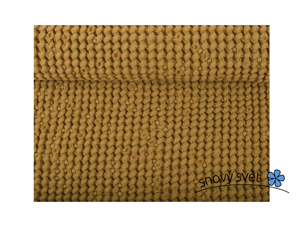 Pololněná látka o vysoké gramáži v tmavě žluté - okrové barvě. Látka je měkčená a se strukturou. Struktura dává materiálu lepší savost a zajímavý vzhled a stejně tak jí propůjčuje měkkost.