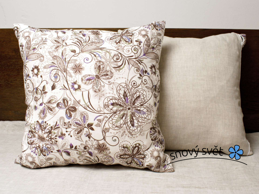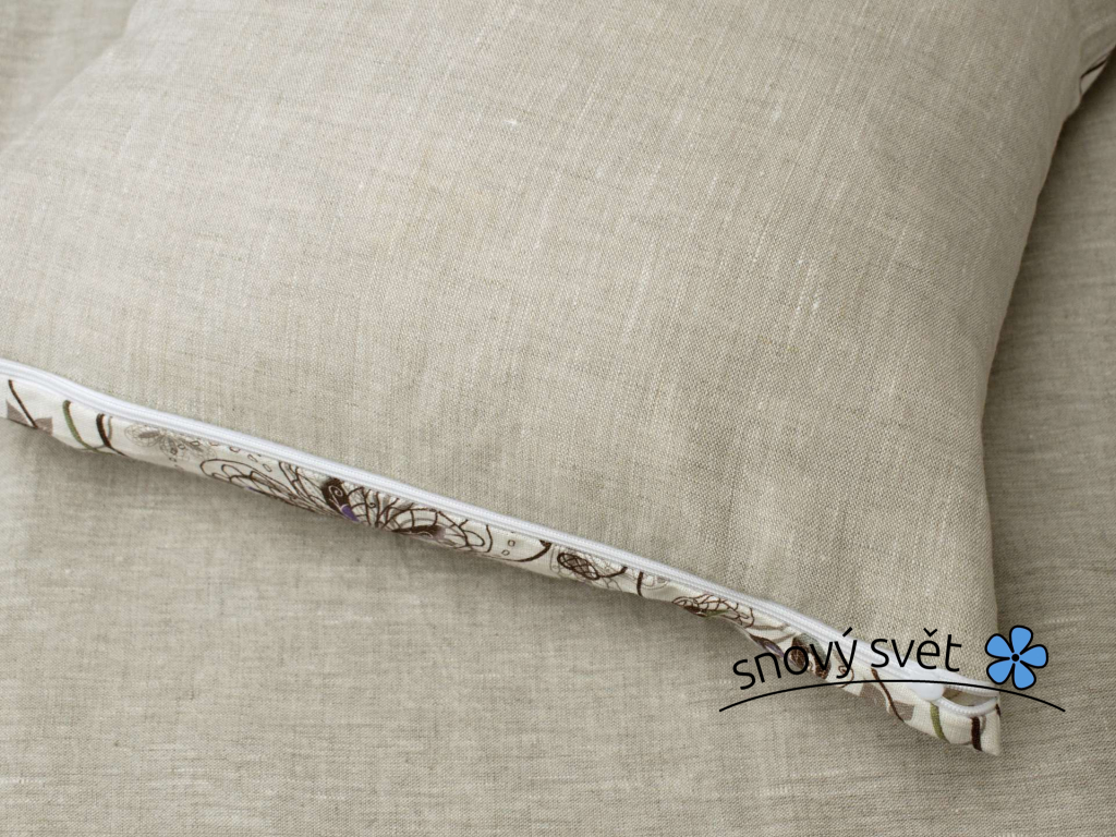 Lněný povlak na polštář na přední straně s potiskem motýlí louky. Na zadní straně je přírodní lněné plátno ve světle šedé barvě s bílým melírem. Zapínání za zip je na zadní straně polštáře. Ze 100% lnu o střední gramáži.