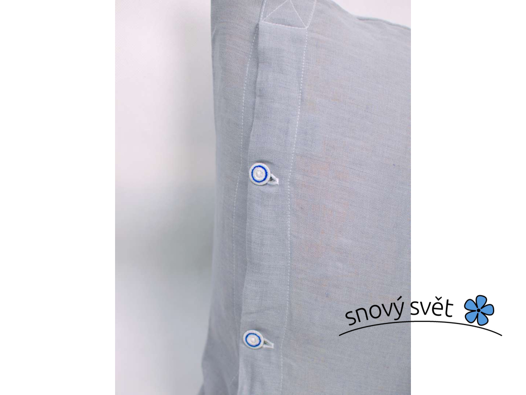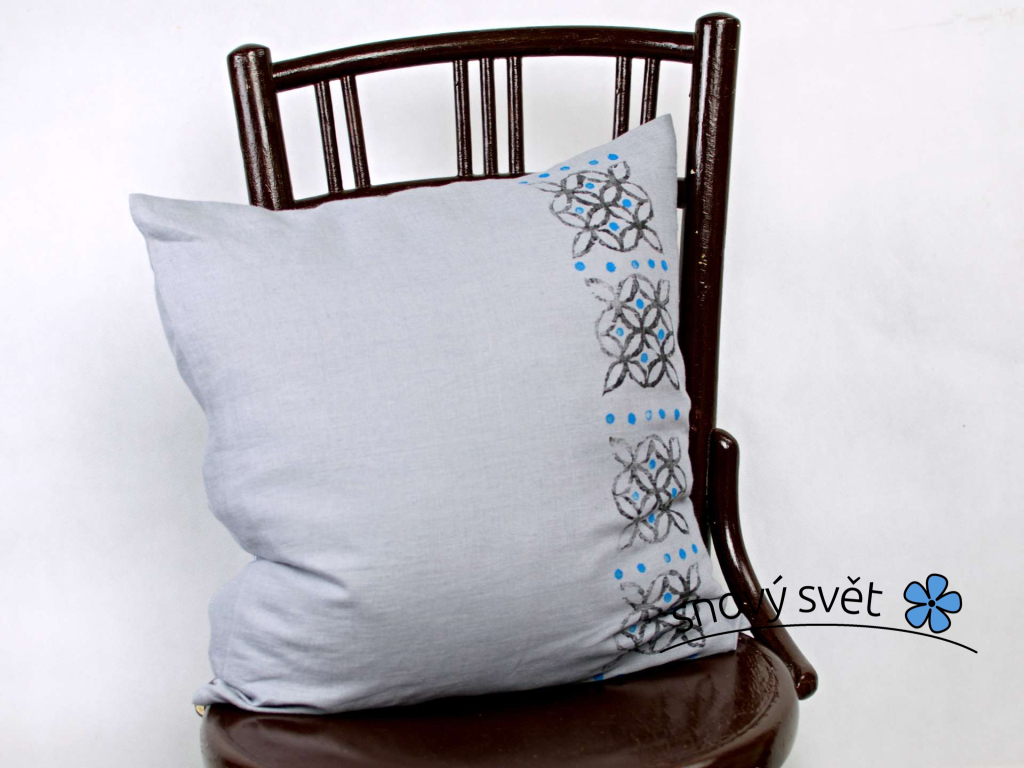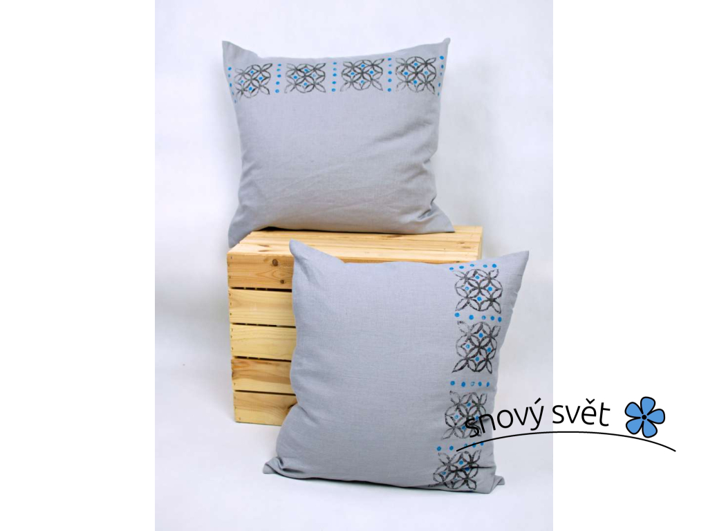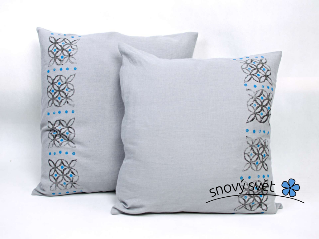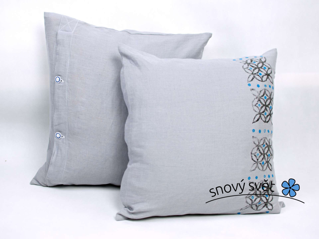 Lněný povlak na polštář z jemného plátna. Povlak je ušitý z plátna barvy holubičí šedi. Na jedné straně je ruční potisk v černé a modré barvě. Zapínání na české nitěné knoflíky, kde jsou kombinované dvě barvy. Z čistého 100% lnu o střední gramáži.