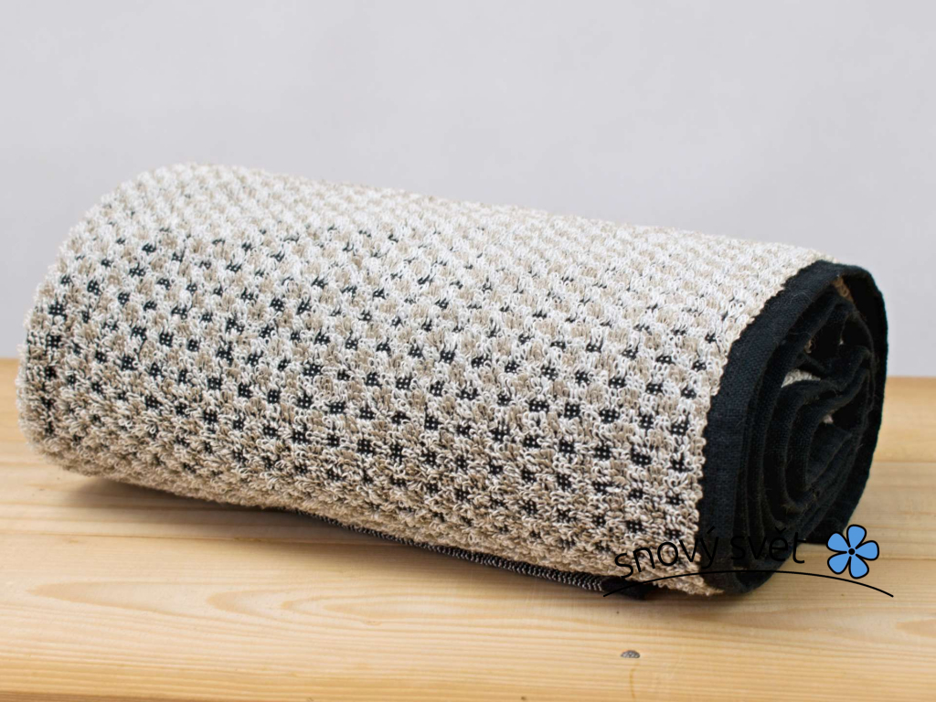 Přírodní ručník s poutkem je praktickým pomocníkem do každé koupelny. Na ručníku se střídají čtverce ze 100% lněného vlákna přírodní barvy a z bambusové viskózy krémová barvy. Froté je tkané na černé bavlněné plátno a díky tomu se tvoří kostičkový vzor. Lněné froté má zdrsnělý povrch, smyčky jsou uzpůsobeny pro masírování pokožky, která se velice dobře prokrví a froté s bambusem je naopak nádherně měkké a velice dobře saje. Je to neobvyklý a moderní design, který vznikl v české tkalcovně. Při používání tak působíte pozitivně na lymfatický systém, obrušujete starou pokožku a preventivně působíte proti celulitidě. Po použití nejen v sauně, bude pokožka vypadat krásná a svěží. lněný materiál ve froté smyčce dává výrobku příjemný chladivý omak, vzdušnost, vysokou savost a přirozeně antibakteriální a antialergenní účinky. Ale nebojte se poškrábání, len praním trochu změkne.