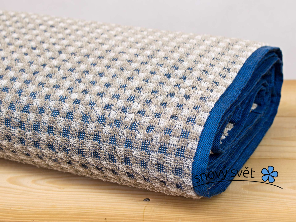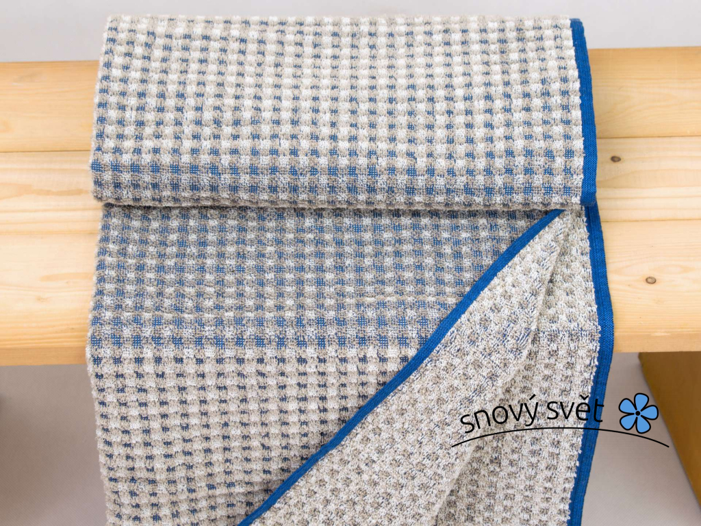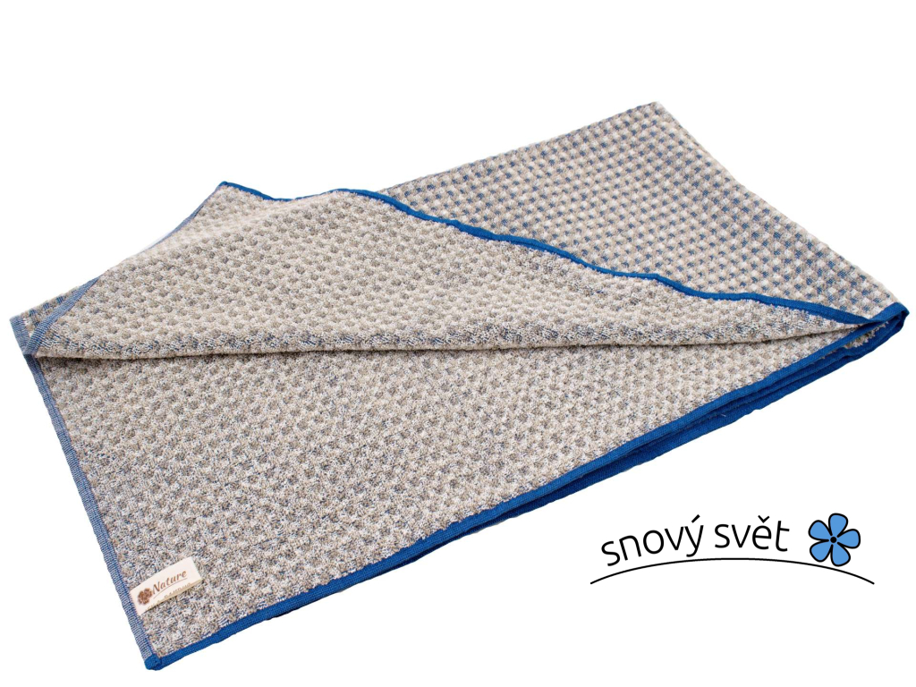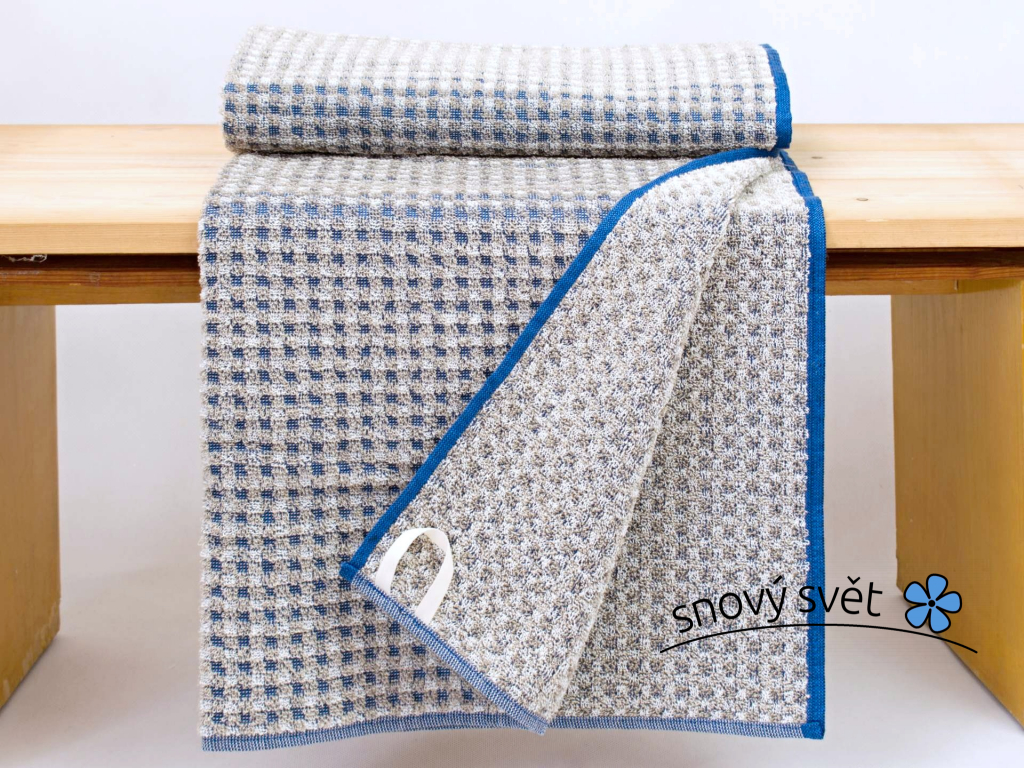 Přírodní osuška s poutkem je praktickým pomocníkem do každé koupelny. Na osušce se střídají čtverce ze 100% lněného vlákna přírodní barvy a z bambusové viskózy. Froté je tkáno na modré bavlněné plátno. Díky tkaní se tvoří kostkovaný vzor. Lněné froté má zdrsnělý povrch, smyčky jsou uzpůsobeny pro masírování pokožky, která se velice dobře prokrví a froté s bambusem je naopak nádherně měkké a velice dobře saje. Je to neobvyklý a moderní design, který vznikl v české tkalcovně. Při používání tak působíte pozitivně na lymfatický systém, obrušujete starou pokožku a preventivně působíte proti celulitidě. Po použití nejen v sauně, bude pokožka vypadat krásná a svěží. lněný materiál ve froté smyčce dává výrobku příjemný chladivý omak, vzdušnost, vysokou savost a přirozeně antibakteriální a antialergenní účinky. Ale nebojte se poškrábání, len praním trochu změkne.