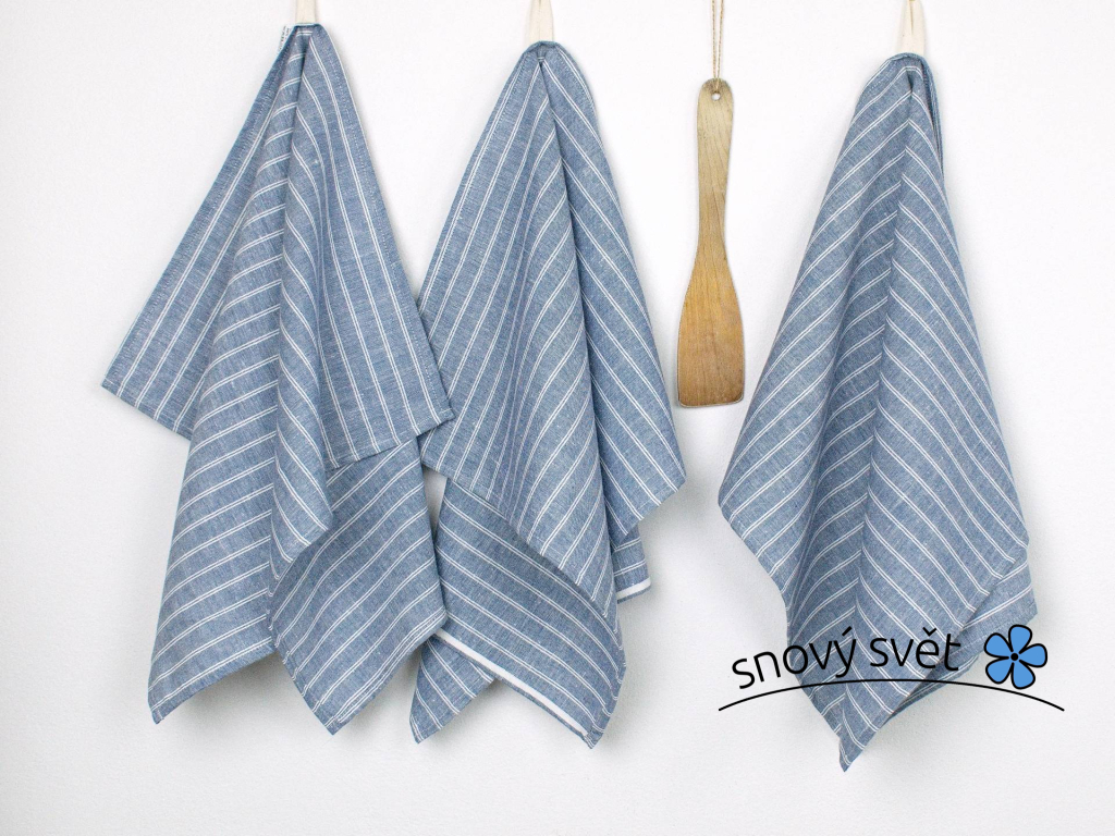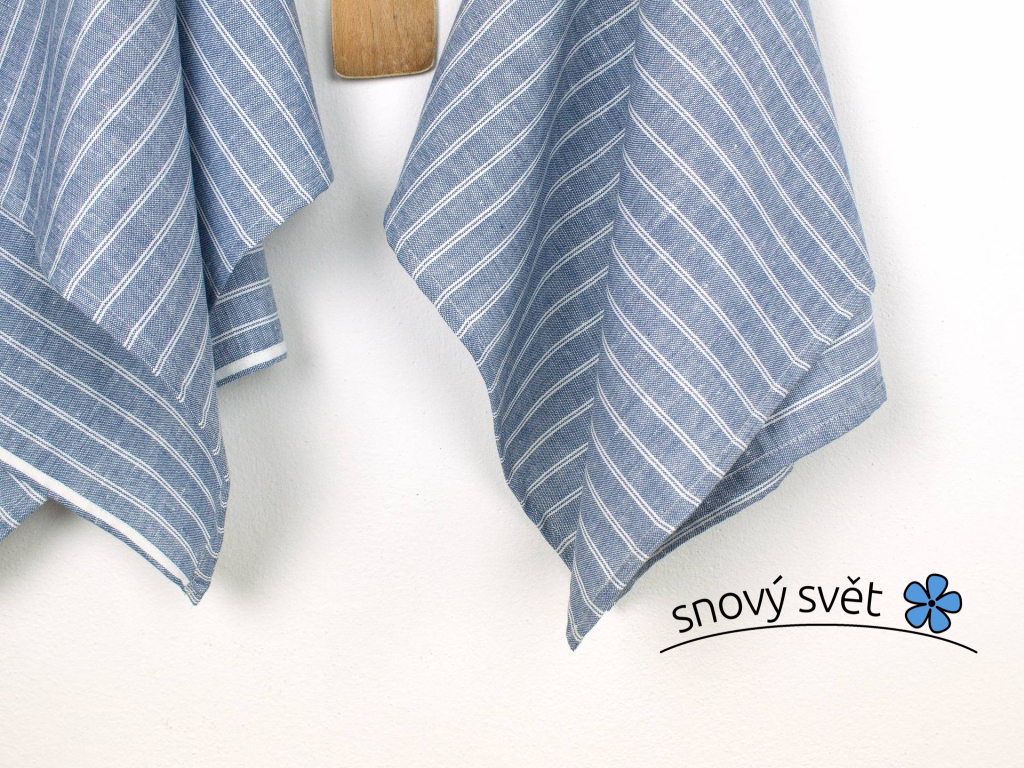 Lněná utěrka z modrého lnu s bílým dvojitým proužkem. Moderní vzhled a tradiční materiál, to je záruka funkčnosti. Utěrka má poutko na zavěšení a hodí se do každé kuchyně. Látka je v kombinaci lnu a bavlny, což zajišťuje dobrou savost. Jedná se o přírodní a recyklovatelný materiál. Utěrku je možné použít i jako prostírání nebo jako malý ručník.