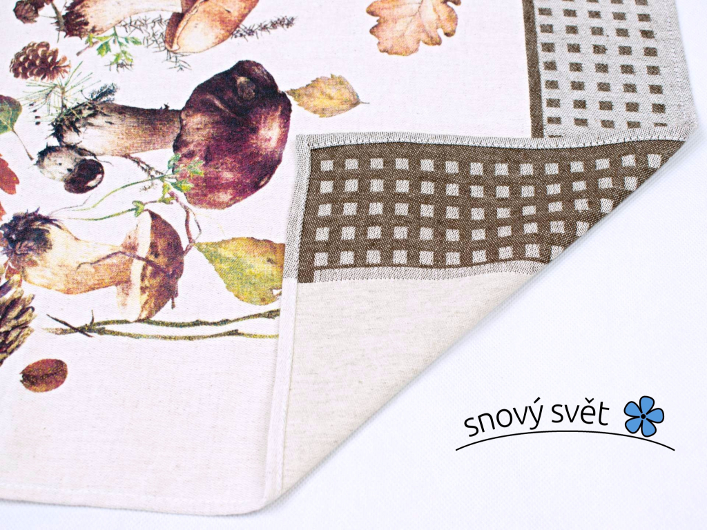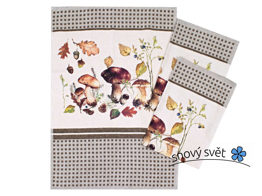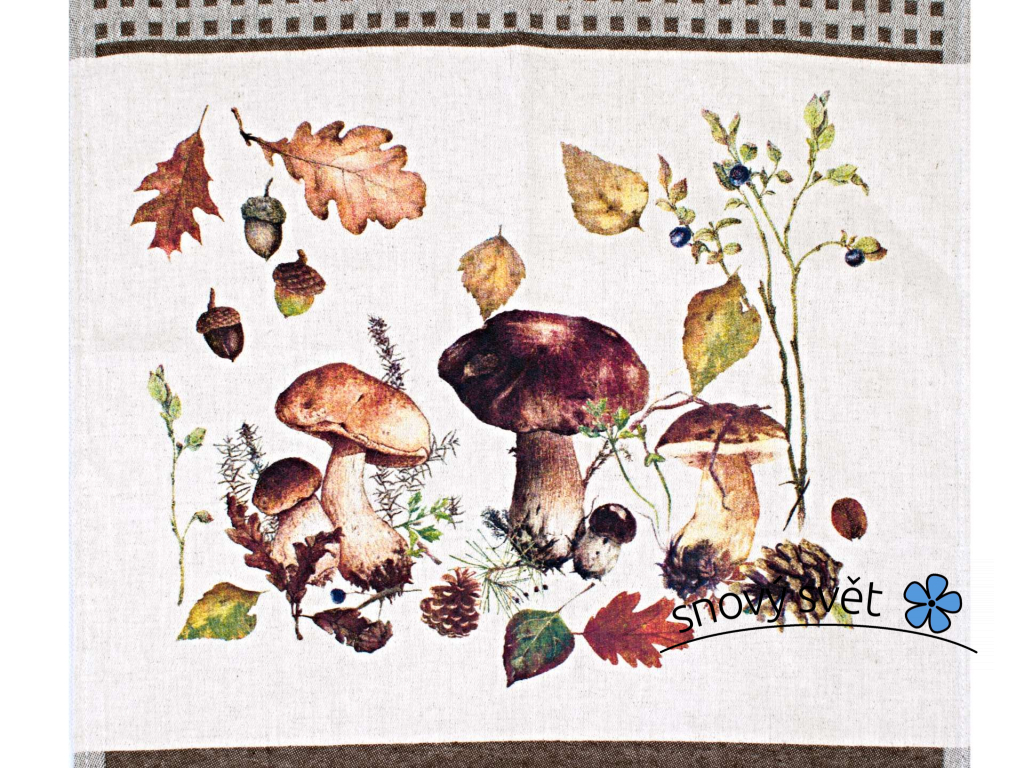 Lněná utěrka s hřiby. Krásné barvy a hezké vyobrazení lesního království, které najdeme v podrostu pod stromy. Utěrka je vyrobena z lněné látky v kombinaci s bavlnou, součástí utěrky je poutko na zavěšení. Plátno je světle šedé a hnědé barvě s žakárovým vzorem a na něm je potisk.