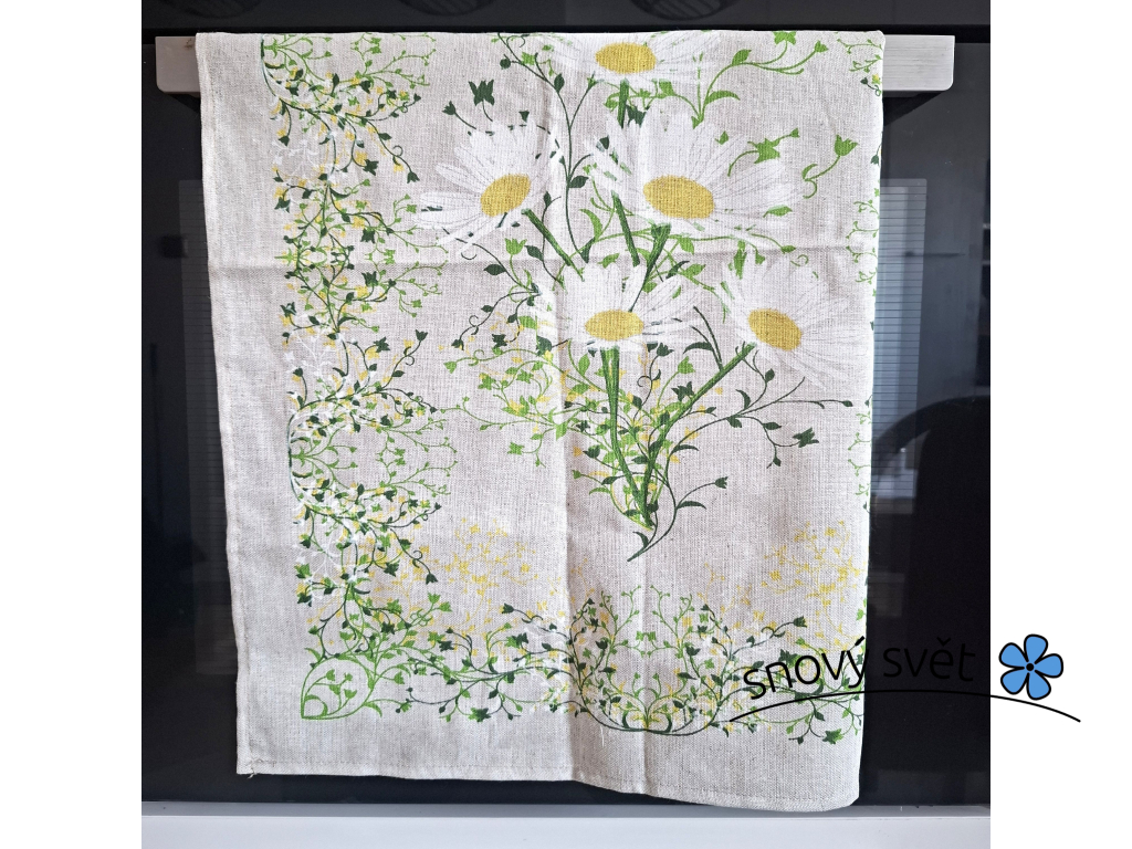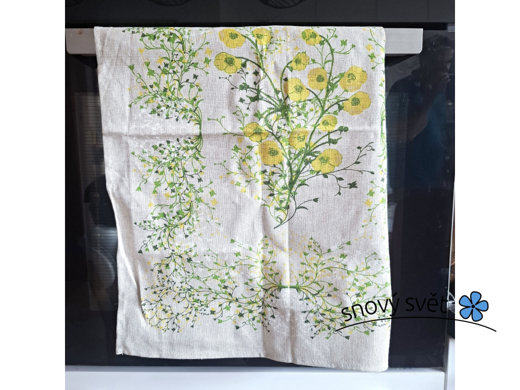 Přírodní podkladová barva lnu v kombinaci s jemnou puntíkatou bordurou a živými barvami květin dodá vaší kuchyni příjemný rustikální a zároveň elegantní nádech.
