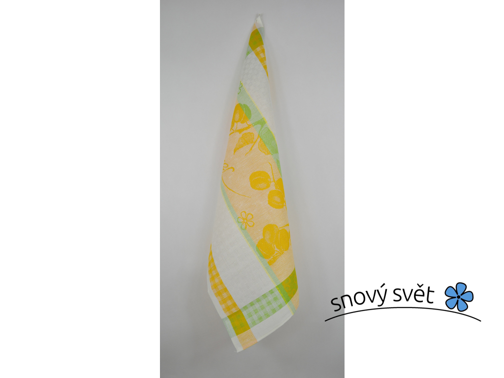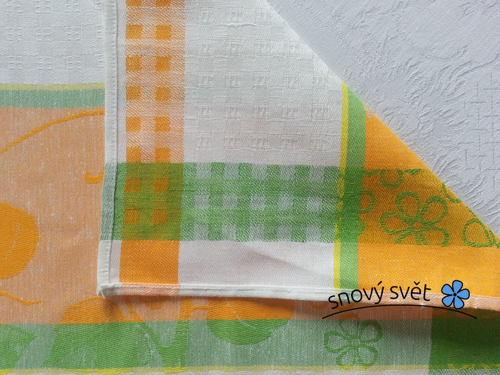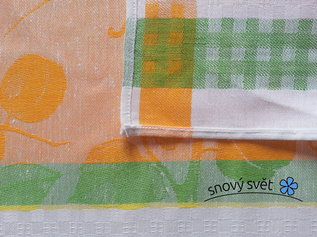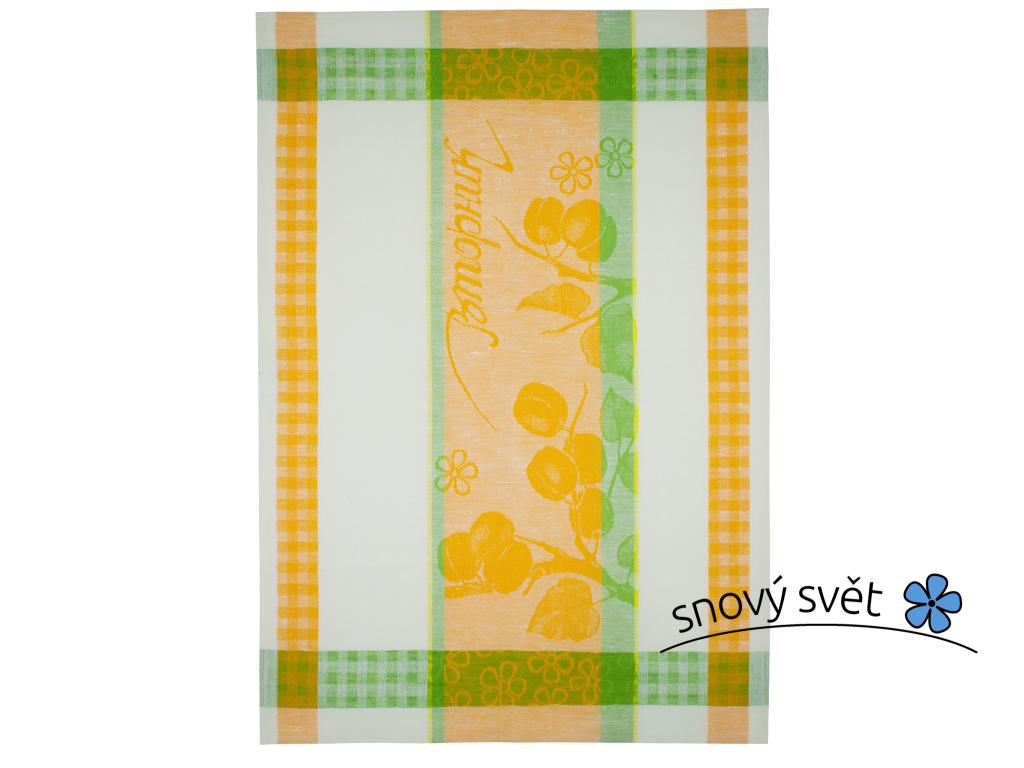 Lněná utěrka do kuchyně s poutkem na zavěšení. Žakárový vzor v svěží oranžovo-zelené barvě nesmí chybět v interiéru. Zároveň vás upozorní, pokud bude úterý. Na látce je vkusně zakomponována kresba meruněk.