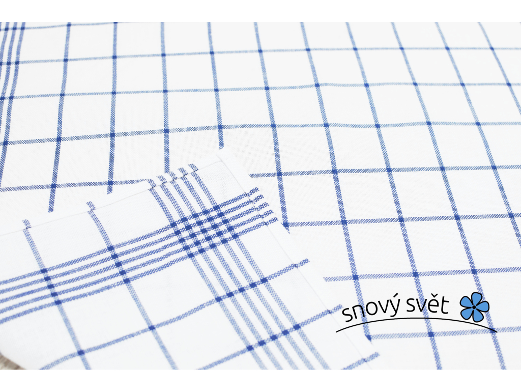 Kuchyňská utěrka o rozměru 50 x 70 cm, klasický vzor s modrými pruhy tvořícími kostky. Jedná se o utěrku o vysoké kvalitě, která zajistí maximální funkčnost pro běžnou domácnost i pro restauraci. Lněná utěrka má velké poutko na zavěšení. Z české výroby tyto utěrky prakticky vymizely, ale nám se podařilo je opět získat právě od českého výrobce, který je nejen šije, ale tká i samotné plátno. Na to jsme právem hrdí, protože takovéto výrobky byly běžnou výbavou našich domácností a hlavním sortimentem tkalcoven. Jistě si nejedna hospodyňka vzpomene na výbavu od našich babiček a maminek, které byly plné takovýchto pokladů. Proto kdo zásoby již vyčerpal, máte jedinečnou možnost si je opět doplnit.