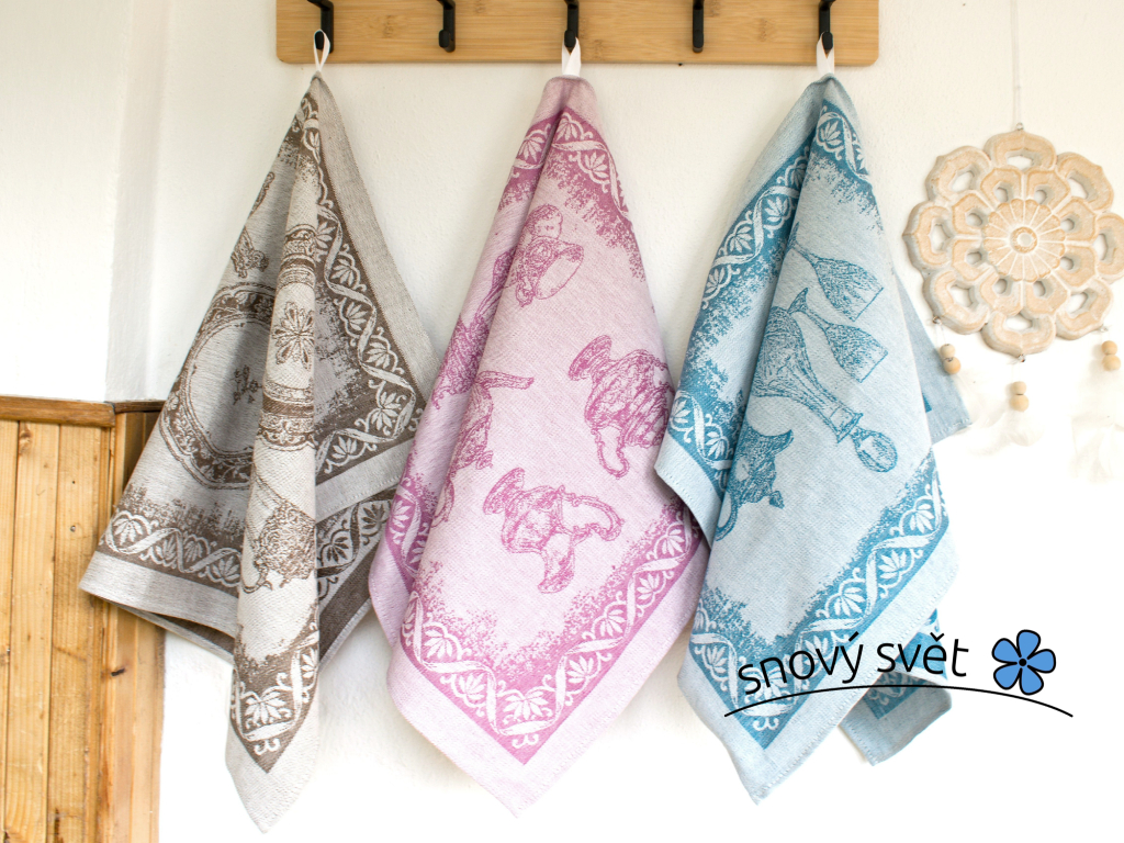 Dárková elegantní sada lněných utěrek je ideální volbou pro každého, kdo ocení vysokou kvalitu a originální design. Je utkána žakárovou technikou, díky které má unikátní oboustranný vzor s motivem secesního stolního servisu. Vzor vzniká tkaním barvených přízí a nejedná se o potisk. Utěrky mají poutko na pověšení.