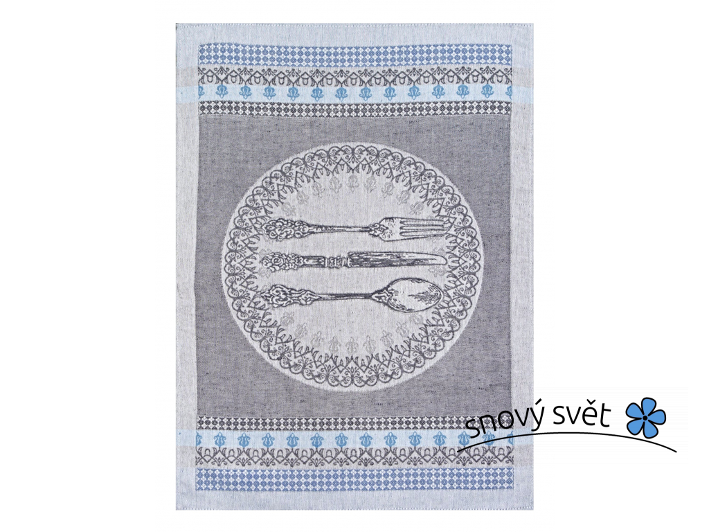 Žakárová utěrka se vzorem příborů a prostřeného stolu pro návštěvu. V modro šedé kombinaci můžeme obdivovat umění, které se skrývá v tkaných obrazech. Jedná se o lněnou utěrku v kombinaci s bavlnou. Funkční a přitom elegantní doplněk do vaší kuchyně. Jistě potěší i jako dárek do nového bytu nebo i do tradiční kuchyně na chatu.