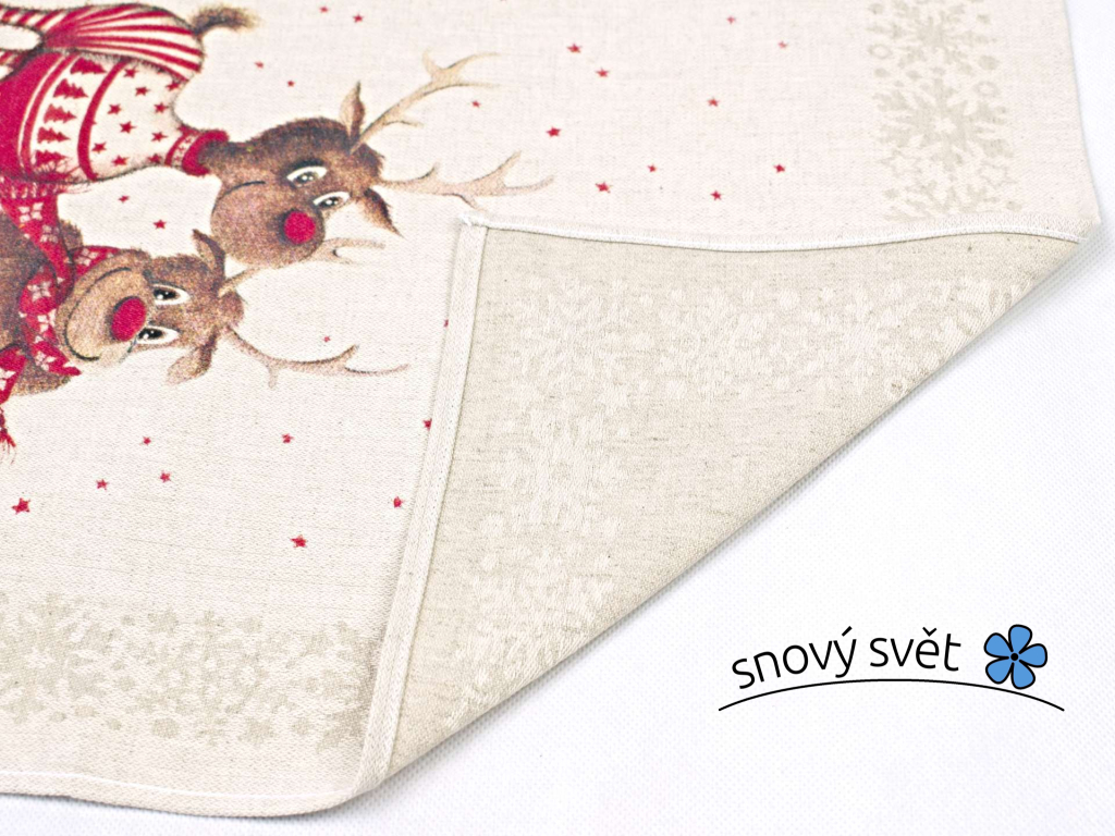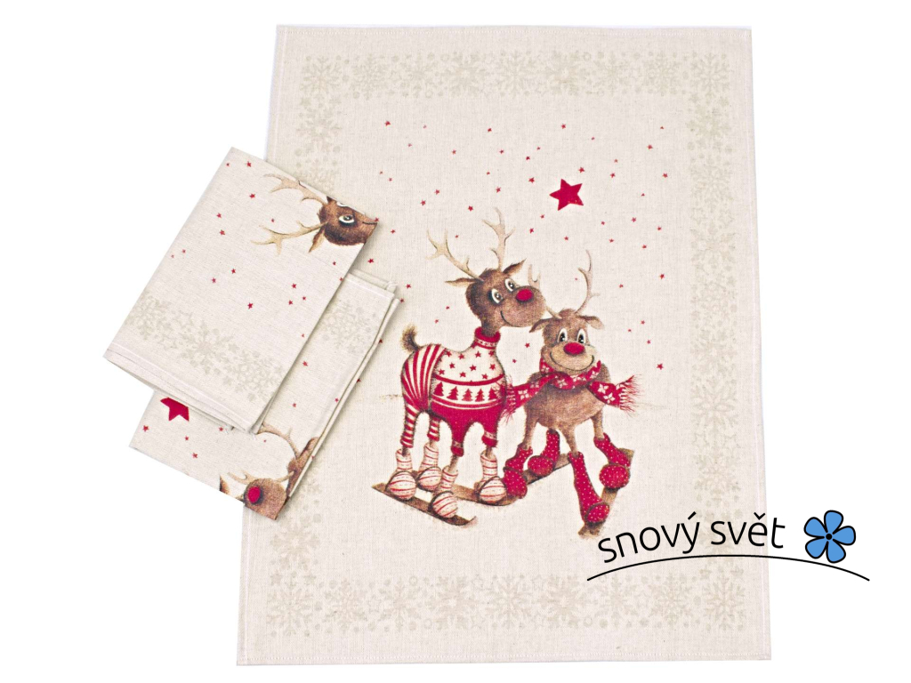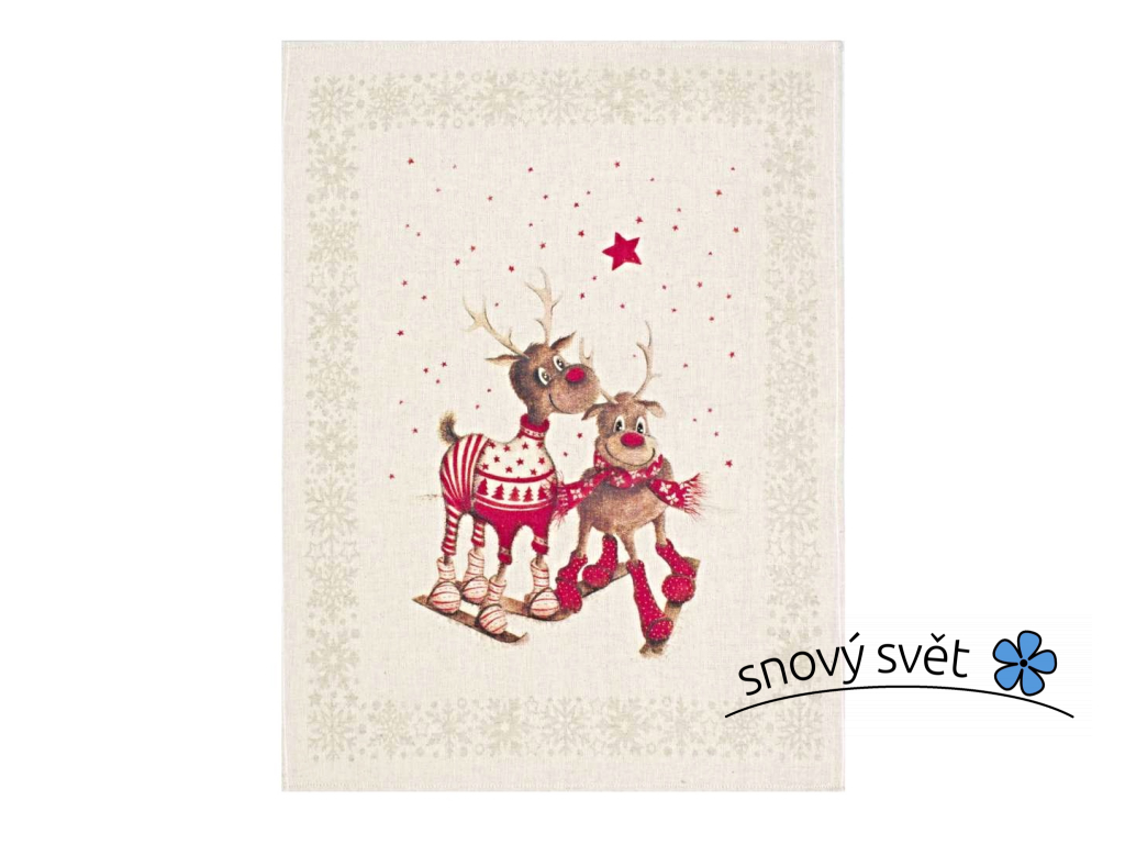 Lněná utěrka do kuchyně s poutkem na zavěšení s vánočním motivem. Na obrázku jsou vyobrazeni sobí kamarádi na lyžích. Podkladová látka má žakárový vzor v šedé barvě s přírodním květinovým vzorem. Obrázek je na utěrce poté natisknut. Utěrka krásně saje a přitom je použit na její výrobu recyklovatelný a rozložitelný materiál.