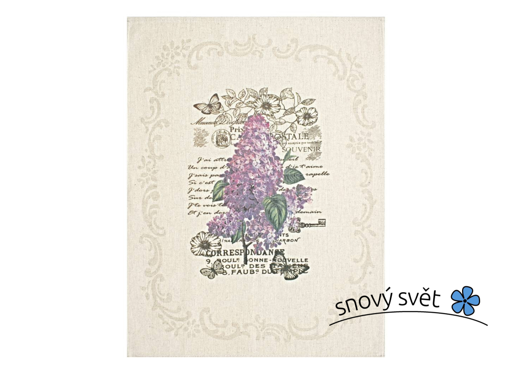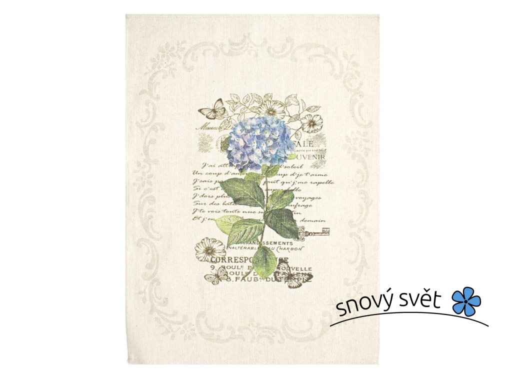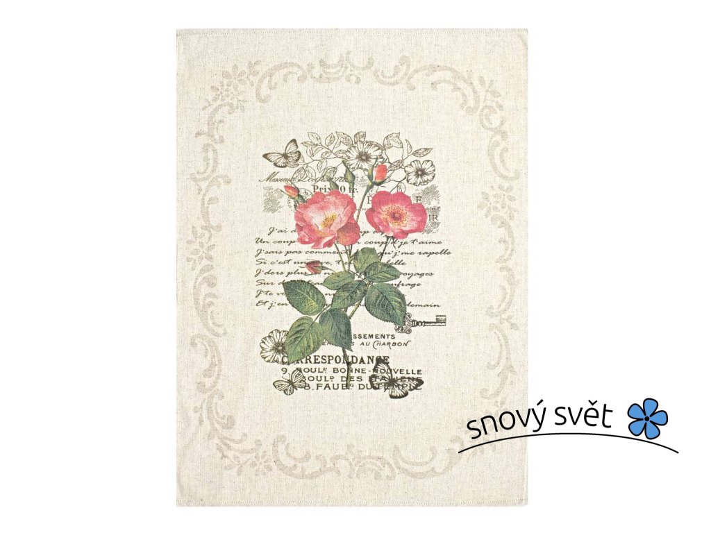 Lněná utěrka v červeném designu s vyobrazením růže, šeříku a modré hortenzie. Je vyrobena z lněné látky v kombinaci s bavlnou, součástí utěrky je poutko na zavěšení. Plátno je světle šedé s žakárovým vzorem a na něm je potisk. Jistě těmito utěrkami uděláte radost každé milovnici květin.