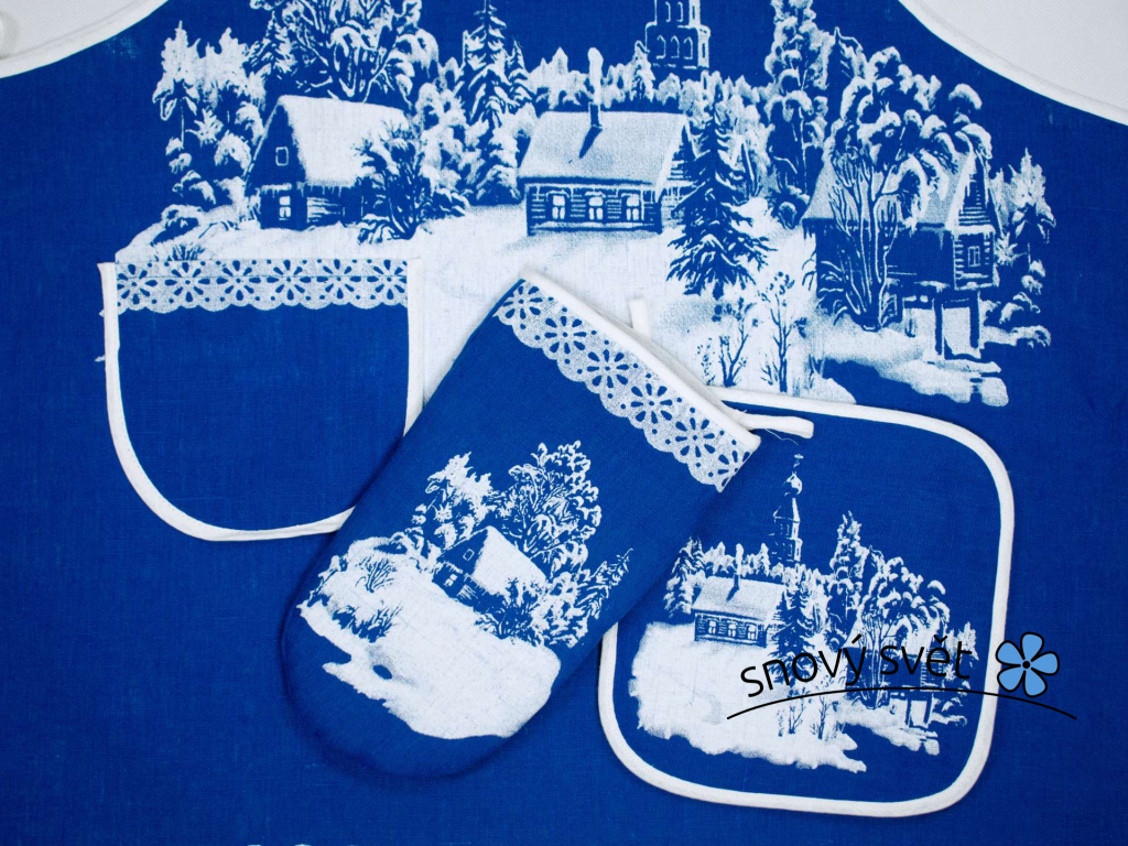 Vánoční dárkový set do kuchyně. V kompletu najdete zástěru, rukavici a chňapku. Všechny části jsou opatřeny bílým potiskem zasněžené vesnice a krajiny. Výrobky jsou ušity ze 100% lněné látky v modré indigo barvě lemované bílou. Tímto setem jistě potěšíte každého nadšence v kuchyni. Lněná látka se vyznačuje svojí vysokou odolností, antibakteriálností a díky svým vlastnostem se výborně hodí do kuchyně.