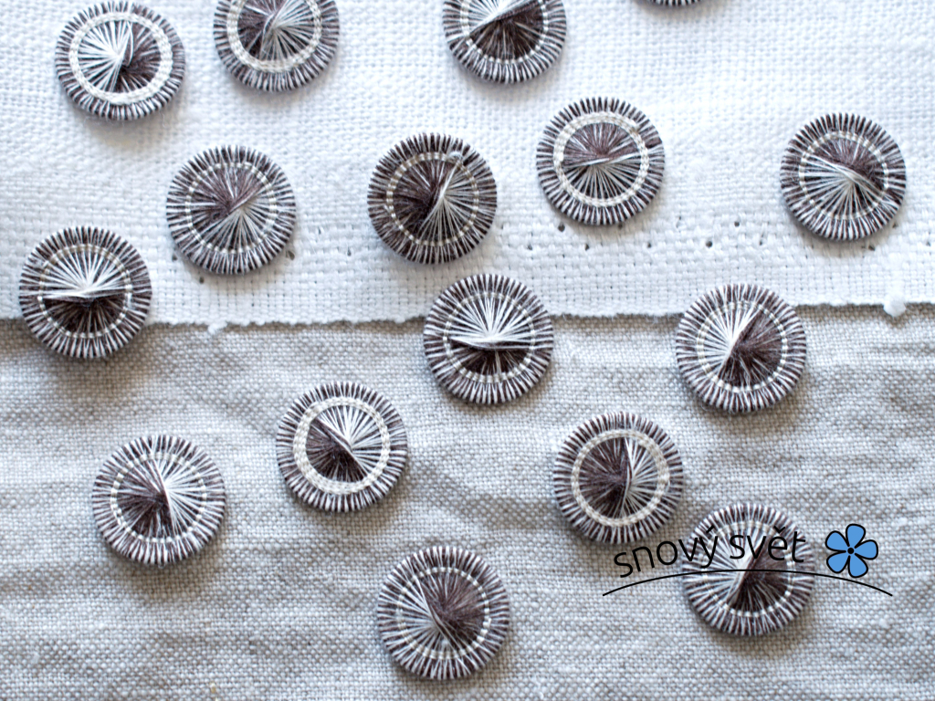 Nitěný knoflík Victoria 26´´ o velikost 15,6 mm, hnědo-krémový melír s krémovým prošitím. Jedná se o klasický a nejvíce používaný typ nitěného knoflíku.