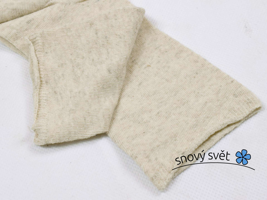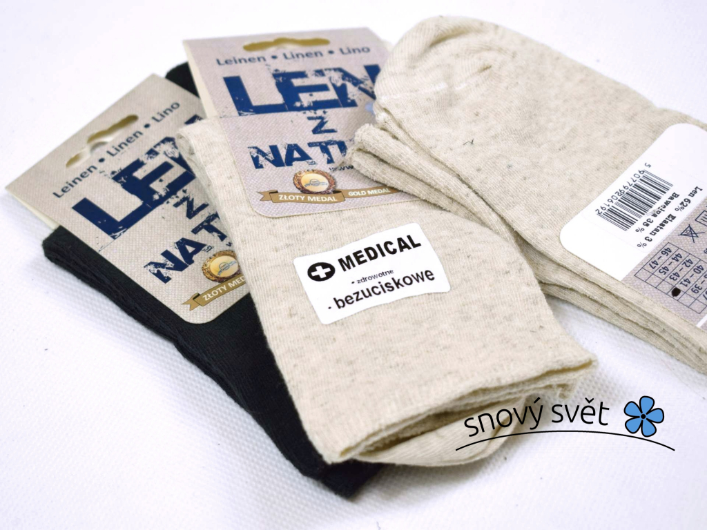 Lněné ponožky vysoké kvality klasického střihu. Jsou vyrobeny ze směsové příze lnu (62%) a bavlny v přírodní barvě. Ponožky jsou vyrobeny s příměsí 3% elastanu, proto velice dobře drží na noze. Zároveň nemají škrtící pružný lem, jsou ve zdravotním provedení. Materiál je jemný, vzdušný a příjemný na celodenní nošení v uzavřené obuvi. Každým praním se ještě změkčuje a zjemňuje. Doporučují se lidem, kteří tráví spoustu času na nohách. Len má vyšší otěruvzdornost a zvyšuje životnost materiálu.