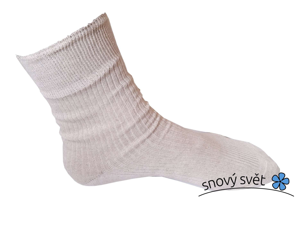 Lněné ponožky vysoké kvality bez umělých příměsí, elastan je obsažen pouze v lemu ponožky. Jsou vyrobeny ze směsové příze lnu (65%) a bavlny v béžová natural. Struktura je vroubkovaná. Ponožky mají zdravotní volnější lem. Materiál je jemný, vzdušný a příjemný na celodenní nošení v uzavřené obuvi. Každým praním se ještě změkčuje a zjemňuje. Doporučují se lidem, kteří tráví spoustu času na nohách.