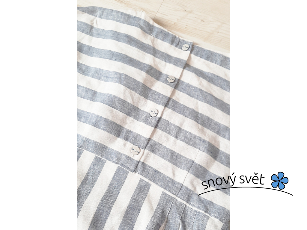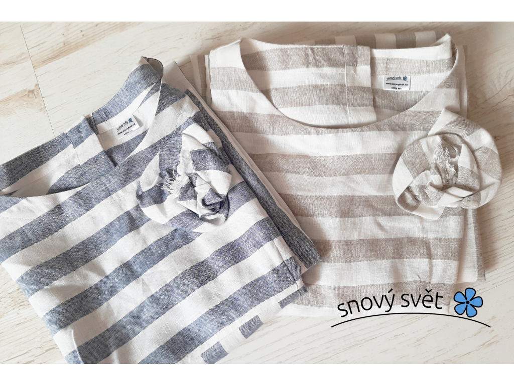 Lněné dámské šaty ze 100% lněné látky s modrým pruhem. Lněné plátno je jemné, měkké a prodyšné o střední gramáži. Šaty mají slušivý dámský střih a jsou velmi pohodlné. Mají kapsy ve švu, což je velmi praktické. V horní části mají Top se spadlými rukávy a na něho navazuje sukně. Zapínání je na knoflíčky vzadu. Jako ozdoba je použita lněné květina. Díky chladivému a vzdušnému efektu lnu jsou vhodné na teplé letní dny. Při vrstvení je možné je nosit celoročně. Přírodní materiál je velmi příjemný. Len se vždy používal i pro jeho dlouhou životnost, protože se časem neopere jako bavlna. Právě naopak. Čas a časté používání mu dá ještě vyšší měkkost, ale bez vlivu na jeho pevnost a celistvost.