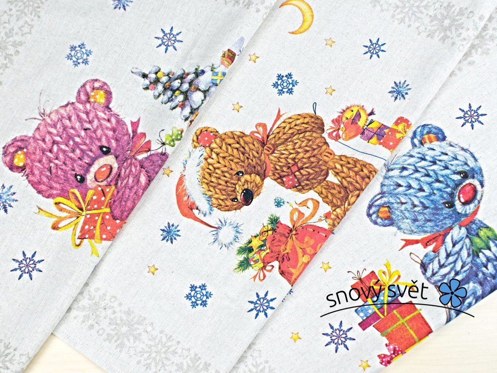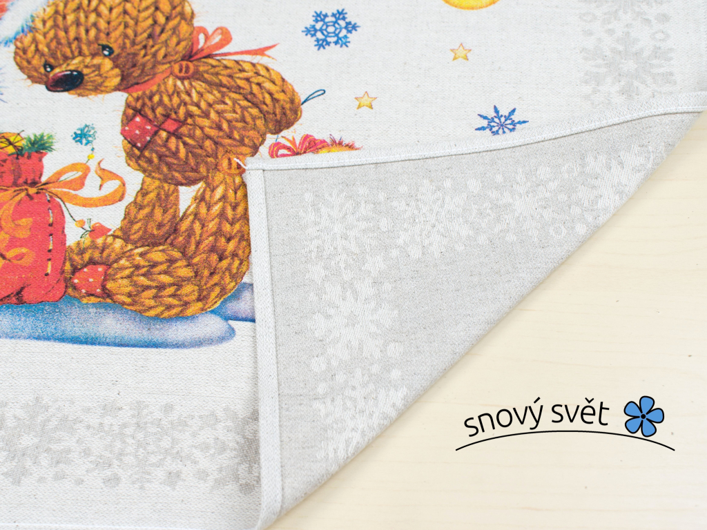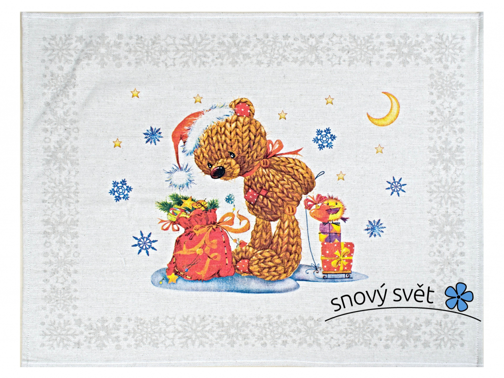 Lněná utěrka s vánoční tématikou. Vyobrazení hnědého medvídka s červeným pytlem plným dárků. Podkladová látka má žakárový vzor v šedé barvě se vzorem vloček. Obrázek je na utěrce poté natisknut. Utěrka má poutko na pověšení.