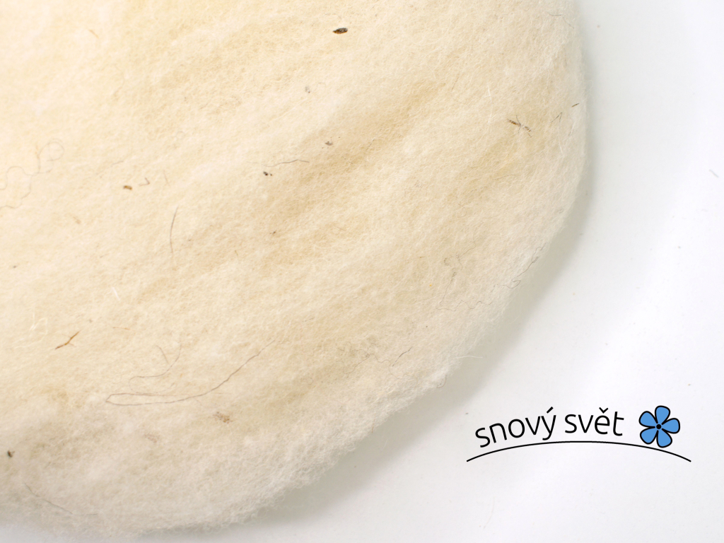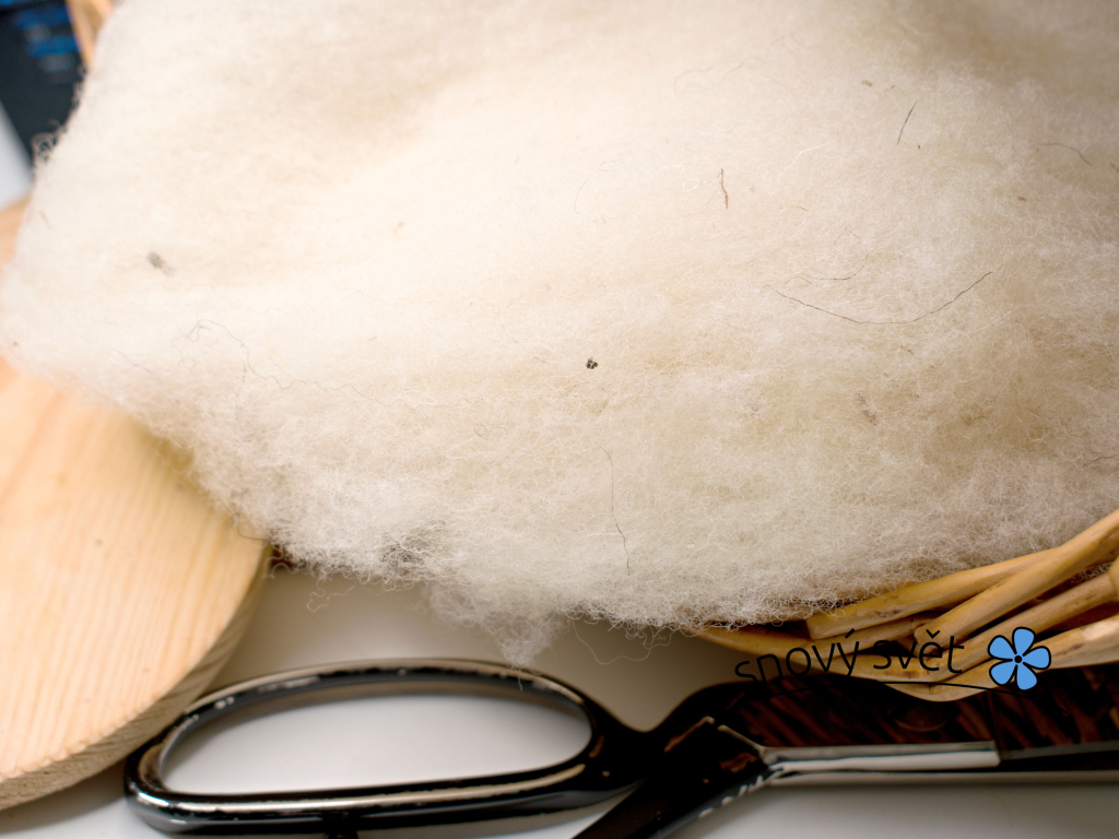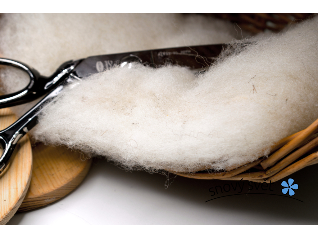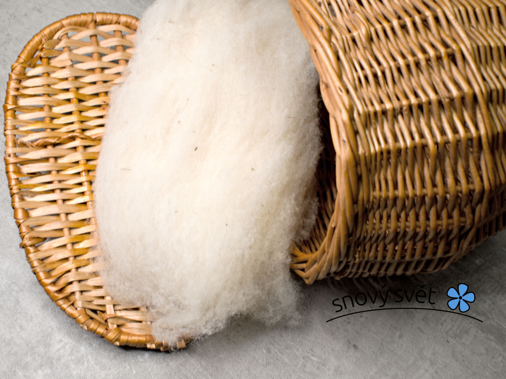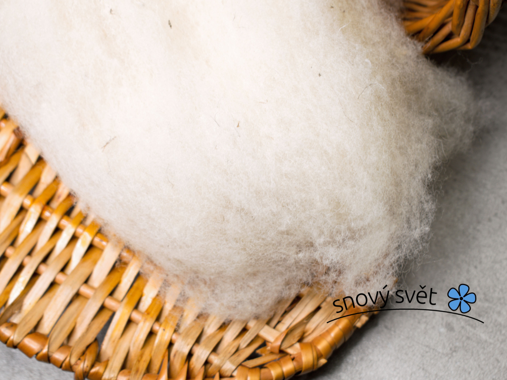 Přírodní ovčí vlna v podobě načechrané vaty, vhodný jako výplň polštářku, pelíšků, zdravotnických pomůcek a dalších dekorací. Jedná se čištěnou a mykanou ovčí vlnu velmi příjemný a prodyšný materiál.