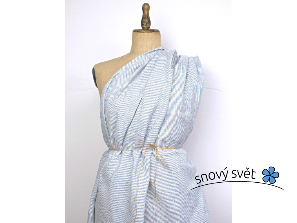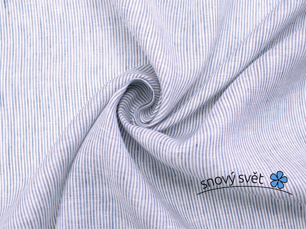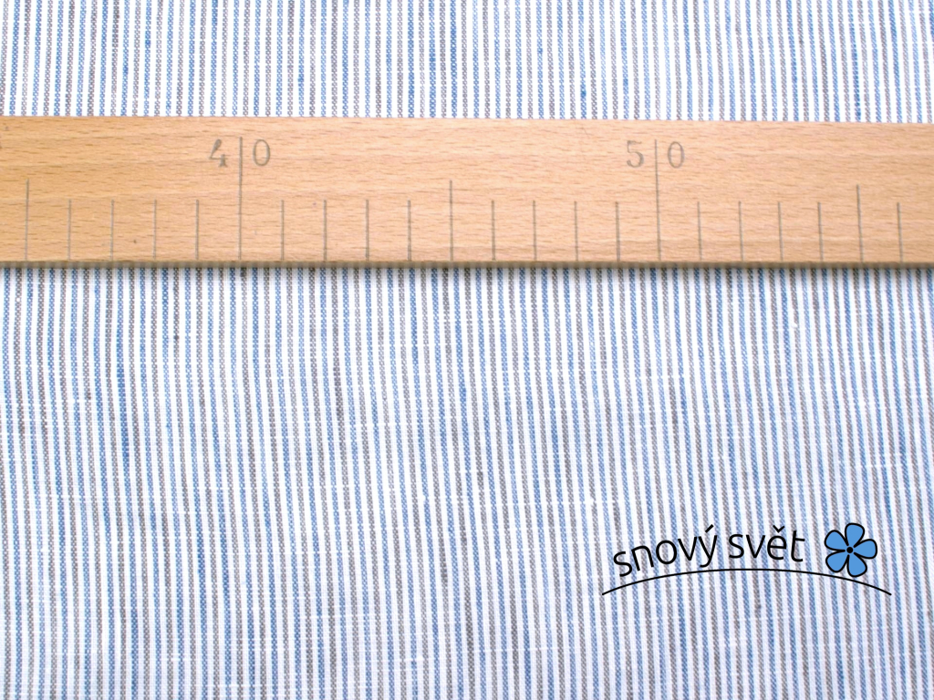 100% lněné plátno s tenkými pruhy modré, bílé a černé příze. Proužek je po délce látky. Šířka pruhů je cca 1mm. Barevnost je tvořena tkaním barvených nití, nejedná se o potisk. Plátno je měkčené z jemné příze. Látka je jemná a vzdušná.