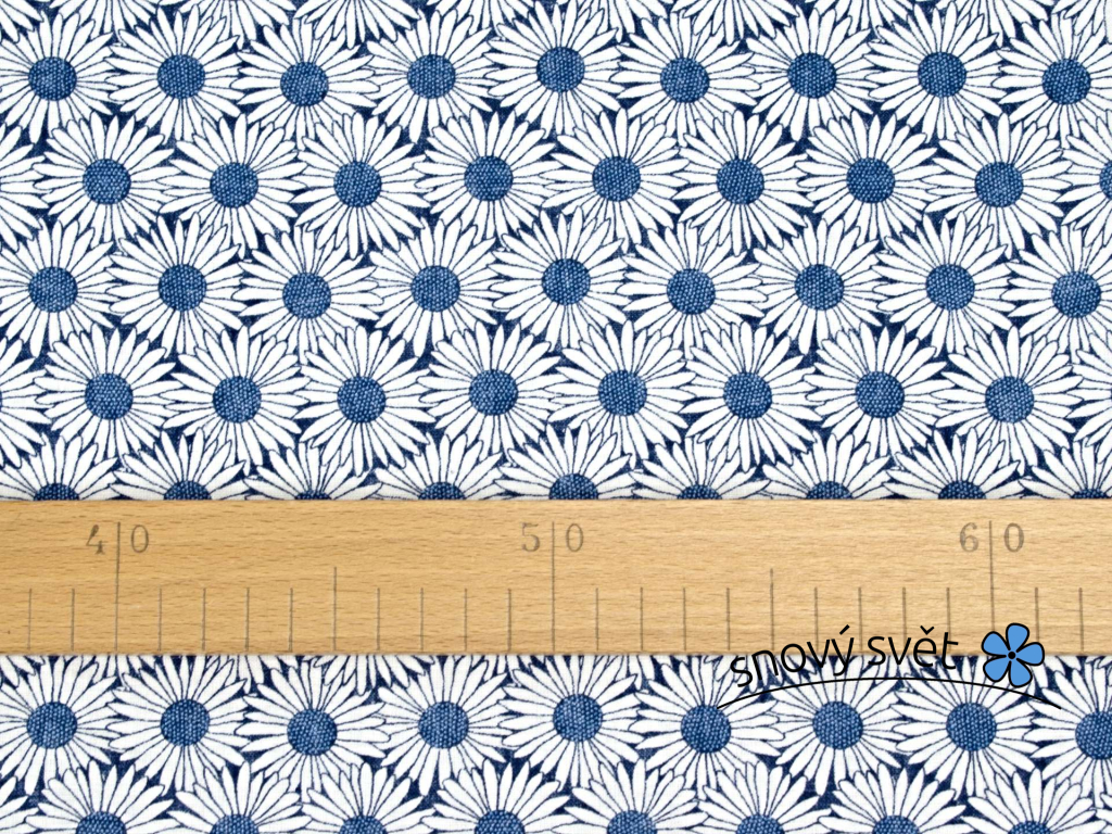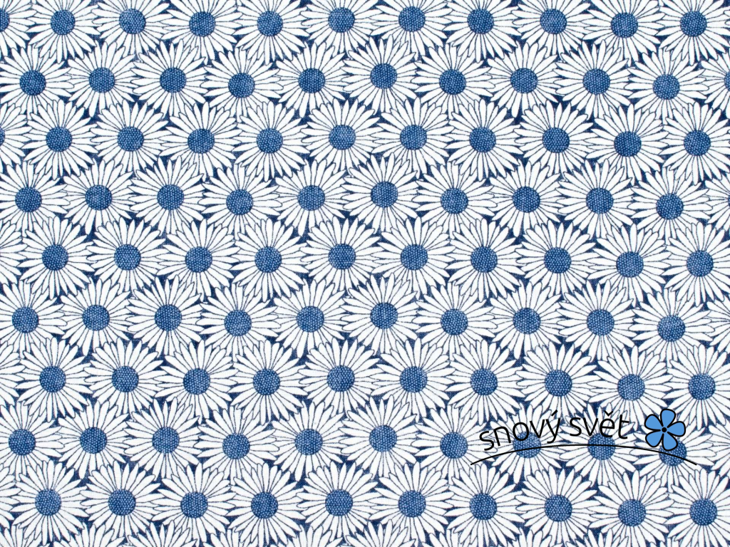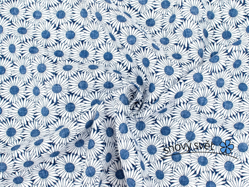 100% lněná látka s potiskem bílých kopretin na modrém pozadí. Látka je velmi jemná a vzdušná. Jedná se francouzský len, na který byl proveden potisk kvalitními barvami v České republice. Lněné plátno je příjemné na dotek, hustě tkané s použitím tenké lněné příze. Příjemná košilová látka, která jemně pruží po útku.