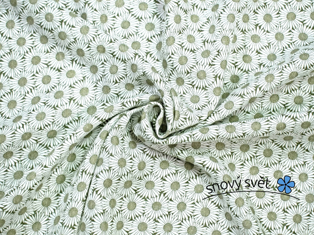 100% lněná látka s potiskem bílých kopretin na zeleném pozadí. Látka je velmi jemná a vzdušná. Jedná se francouzský len, na který byl proveden potisk kvalitními barvami v České republice. Lněné plátno je příjemné na dotek, hustě tkané s použitím tenké lněné příze. Příjemná košilová látka, která jemně pruží po útku.