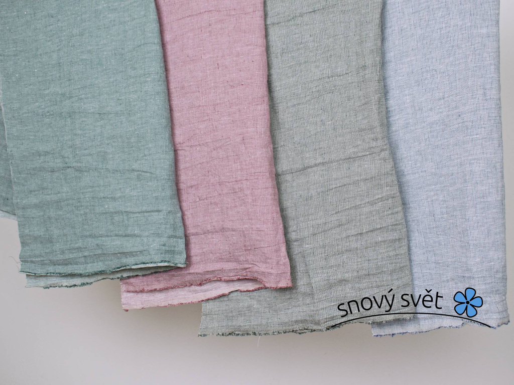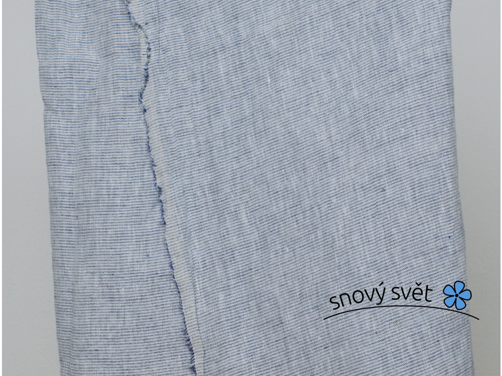 100% lněné plátno barvy modré, bílé a šedé. Tkaním příze vznikají tenoučké proužky, které jsou po šířce látky. Látka je měkčená, velice příjemná. Hustě tkaná a výhoda je její velká šíře. Materiál má přirozenou mačkavost.