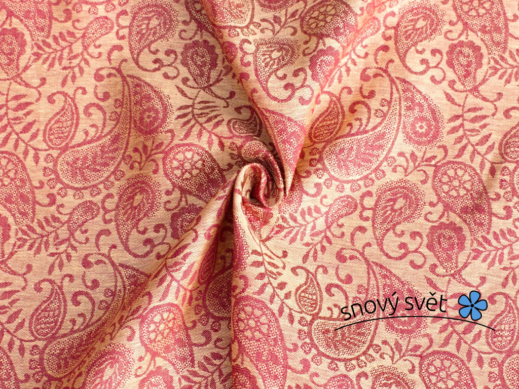 Lněná látka o střední gramáži bez měkčení. Žakárový vzor s květinovým vzorem, který je oboustranný. Plátno je tkané žlutou a červenou přízí. Látka má přirozený lesk s pevný krajem. Látka nyní měkčená, ale je v režné úpravě.