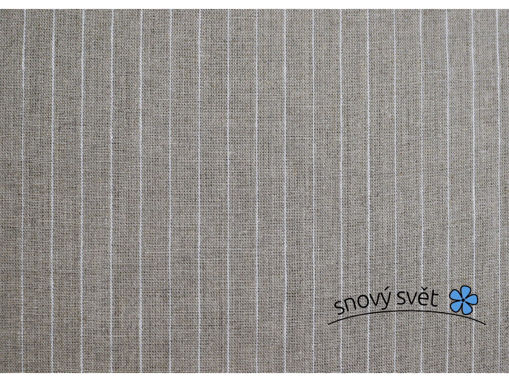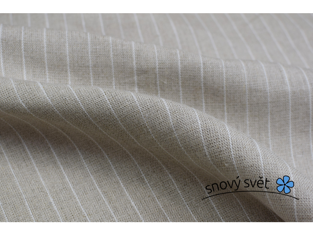 Lněná látka přírodní barvy s bílým proužkem. Bílý proužek je po délce tkaniny. Látka je sanforizovaná, tedy měkčená a již vysrážená z výroby. Z české výroby v kvalitním provedení.