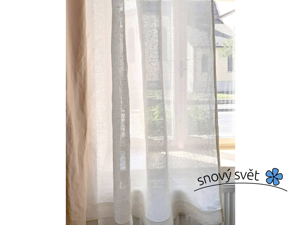 Průhledná záclonovina - 100% lněné plátno. Jedná se o krémový odstín bílé. Plátno není měkčené a je hrubé, běžným praním a používáním změkne. I když má vyšší gramáž, tak je ale krásně průhledné z interiéru, protože má siťovou strukturu. Je použita střední příze, ale je řídce tkaná.