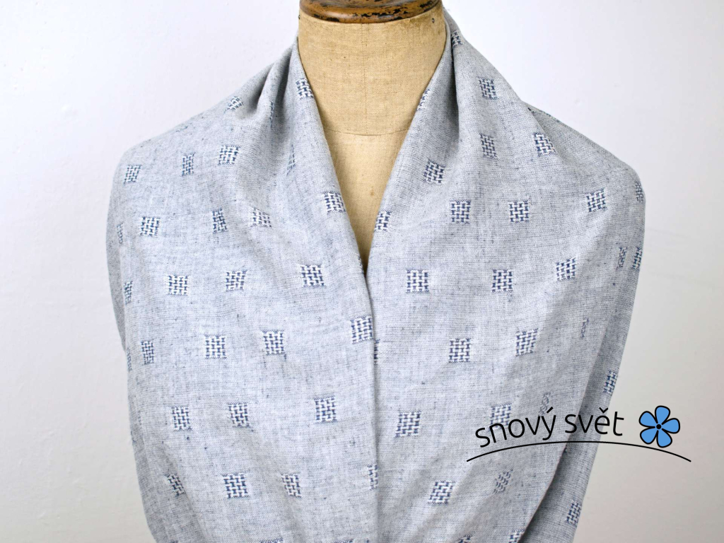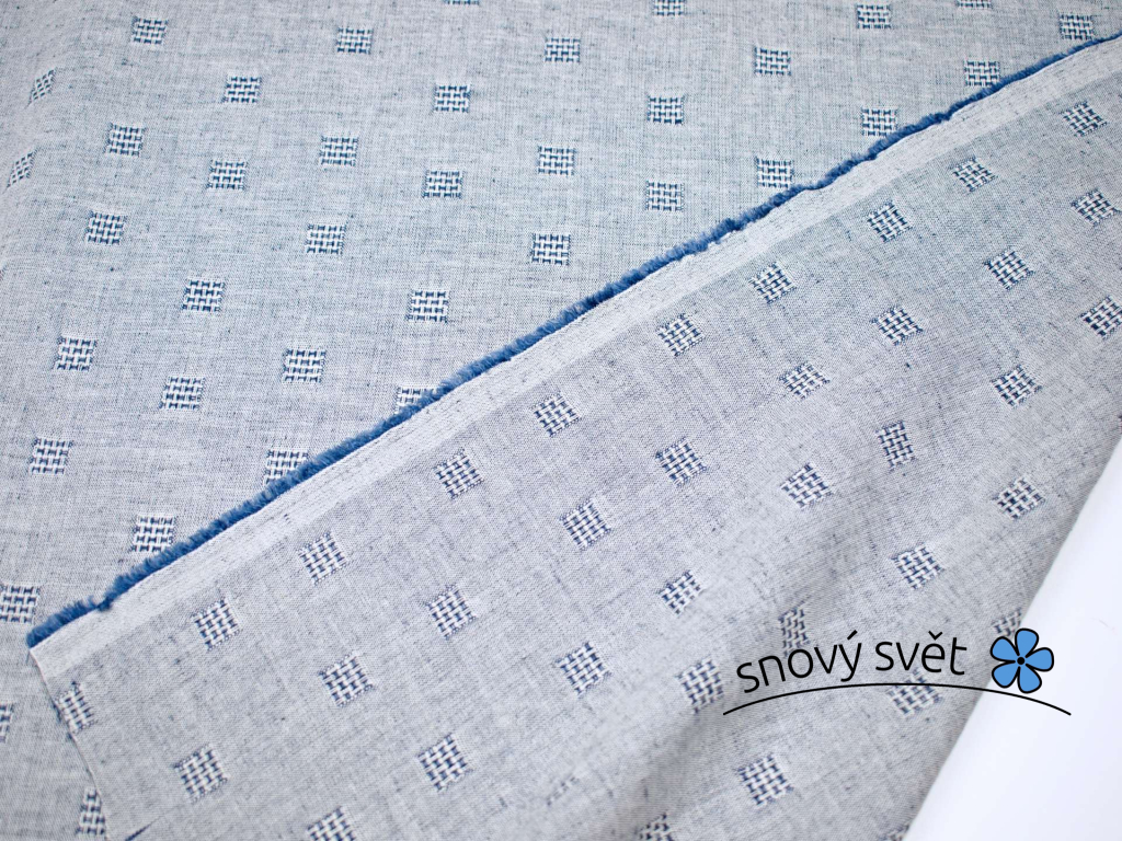 Lněná látka se zajímavým protkáváním obsahuje 44% lnu a 56% bavlny. Osnova je tvořena bílou přízí a v útku je modrá příze. Díky tkaní jsou v ploše tvořeny čtverce a vzor je oboustranný. Metráž je již měkčená, střední gramáže. Poslouží dobře, jak při šití doplňků do domácnosti, tak také k ušití pěkných kalhot či šatů. Vhodné i na závěsy.