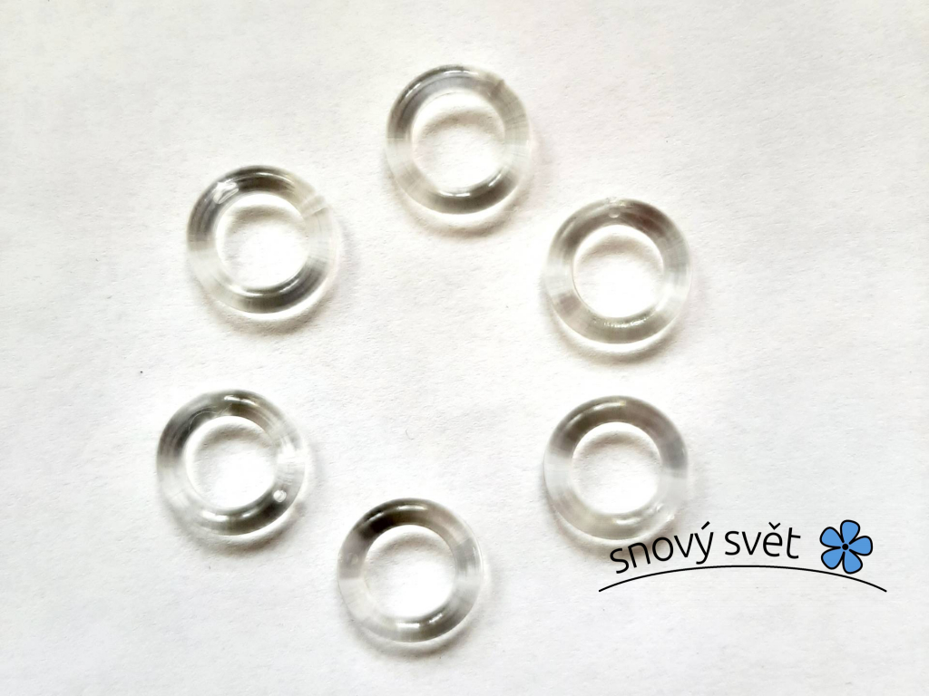 Plastový záclonový kroužek s vnitřním průměrem 8 mm, vnější průměr 13 mm. Transparentní. Vhodný pro našití na záclony nebo jako vodič pro římské a rakouské rolety.